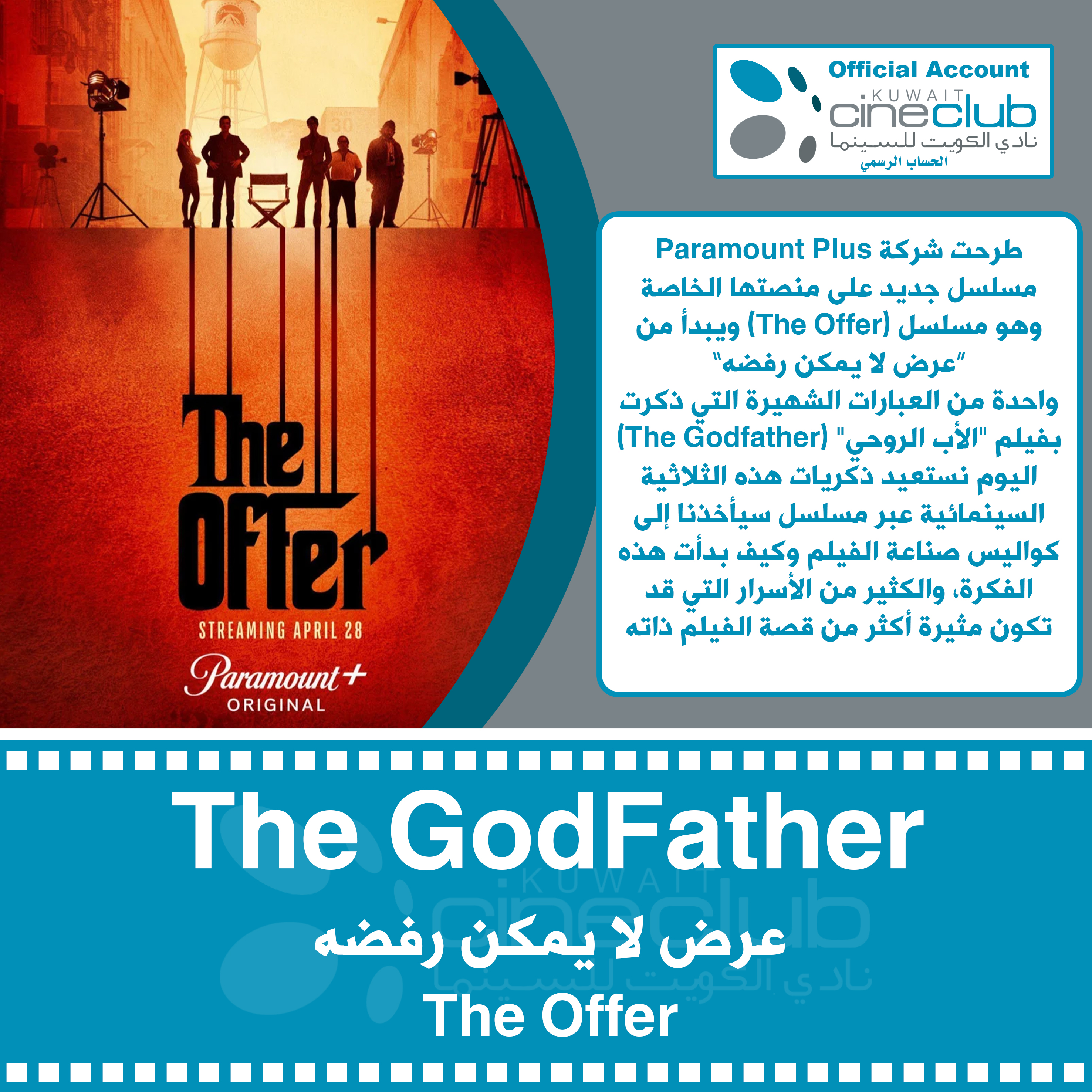 طرحت شركة Paramount Plus مسلسل جديد على منصتها الخاصة وهو مسلسل (The Offer) ويبدأ من “عرض لا يمكن رفضه” واحدة من العبارات الشهيرة التي ذكرت بفيلم "الأب الروحي" (The Godfather) اليوم نستعيد ذكريات هذه الثلاثية السينمائية عبر مسلسل سيأخذنا إلى كواليس صناعة الفيلم وكيف بدأت هذه الفكرة، والكثير من الأسرار التي قد تكون مثيرة أكثر من قصة الفيلم ذاته