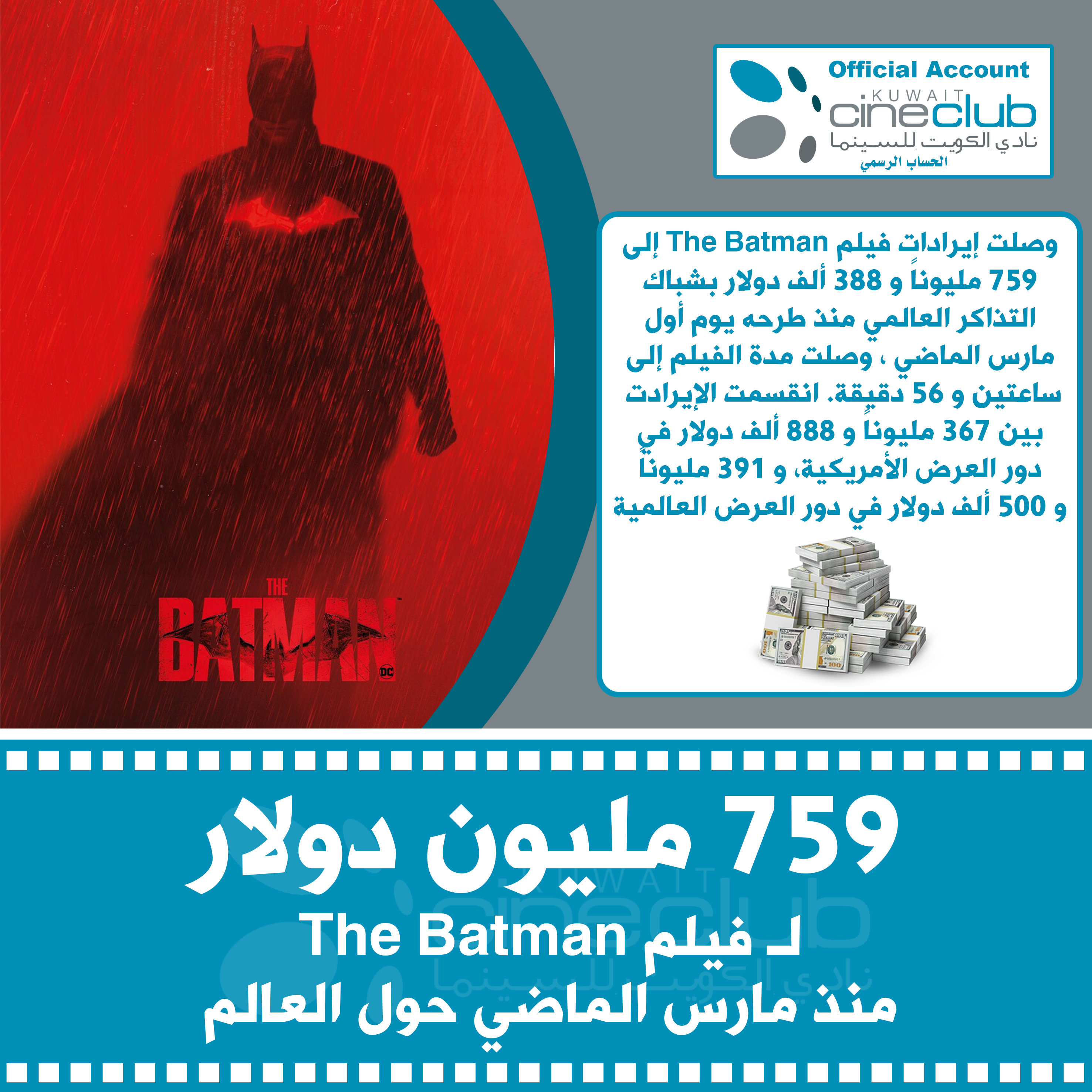 وصلت إيرادات فيلم The Batman إلى 759 مليوناً و 388 ألف دولار بشباك التذاكر العالمي منذ طرحه يوم أول مارس الماضي ، وصلت مدة الفيلم إلى ساعتين و 56 دقيقة. انقسمت الإيرادت بين 367 مليوناً و 888 ألف دولار في دور العرض الأمريكية، و 391 مليوناً و 500 ألف دولار في دور العرض العالمية