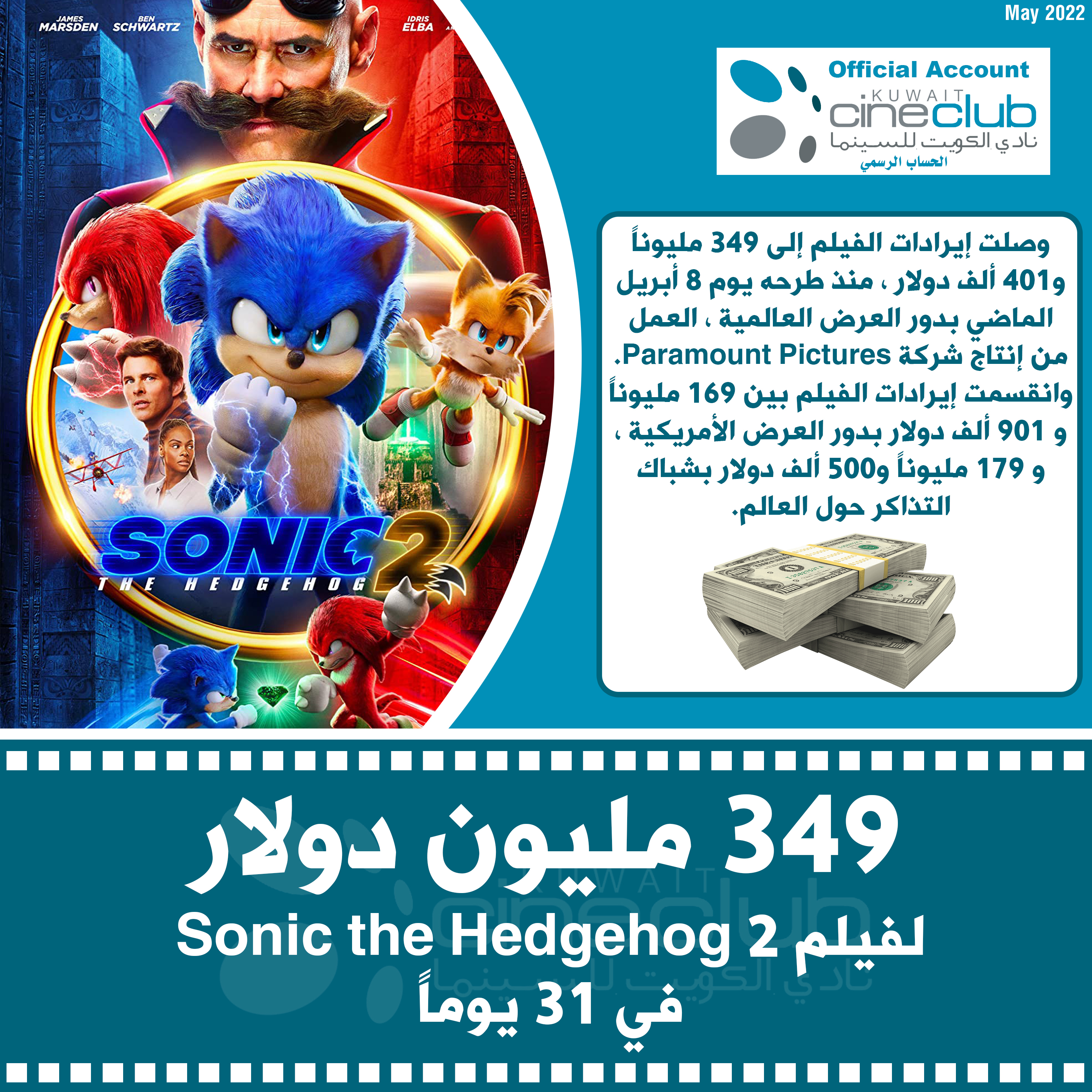 349 مليون دولار لفيلم Sonic the Hedgehog 2 في 31 يوماً
