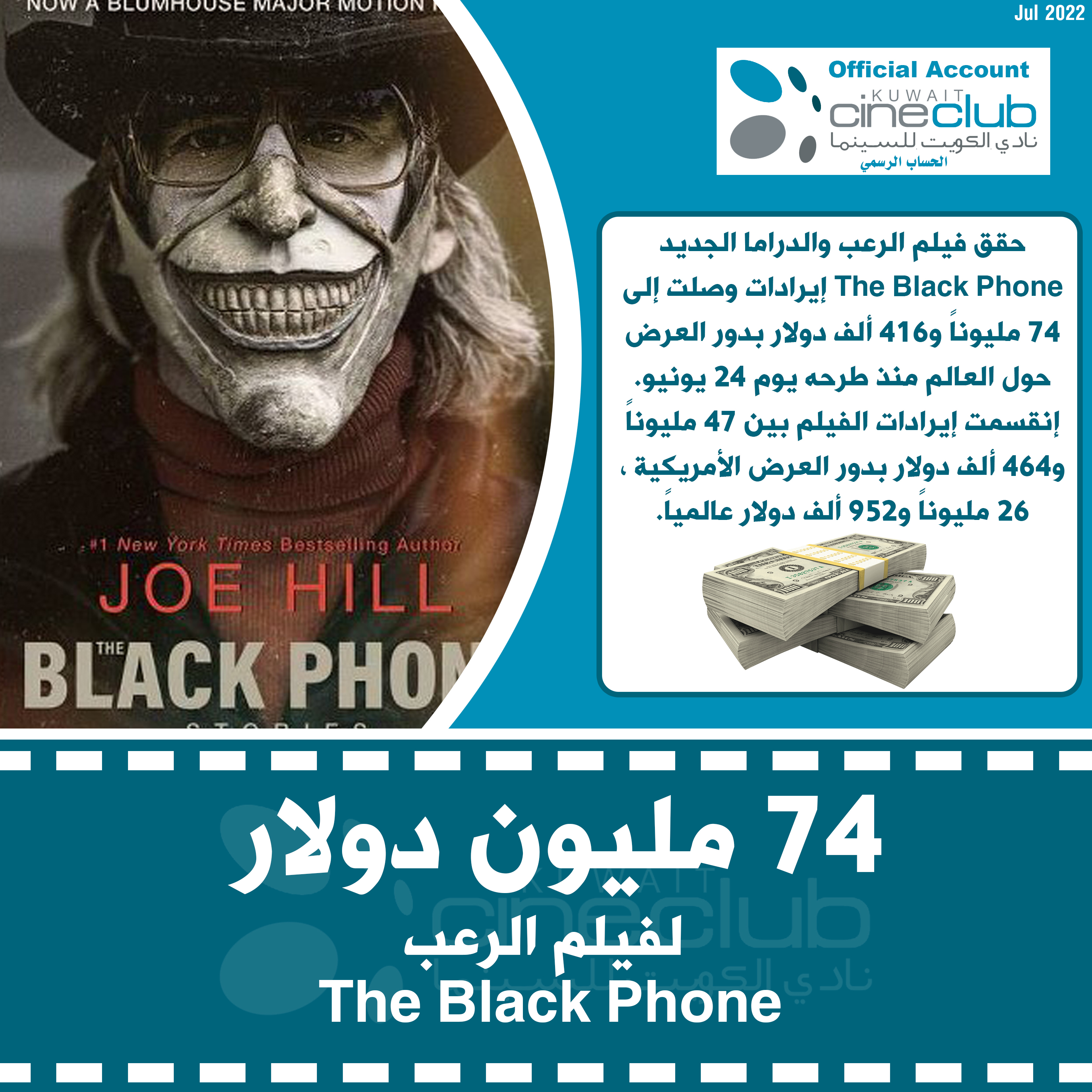 حقق فيلم الرعب والدراما الجديد The Black Phone إيرادات وصلت إلى 74 مليوناً و416 ألف دولار بدور العرض حول العالم منذ طرحه يوم 24 يونيو. إنقسمت إيرادات الفيلم بين 47 مليوناً و464 ألف دولار بدور العرض الأمريكية ، 26 مليوناً و952 ألف دولار عالمياً.