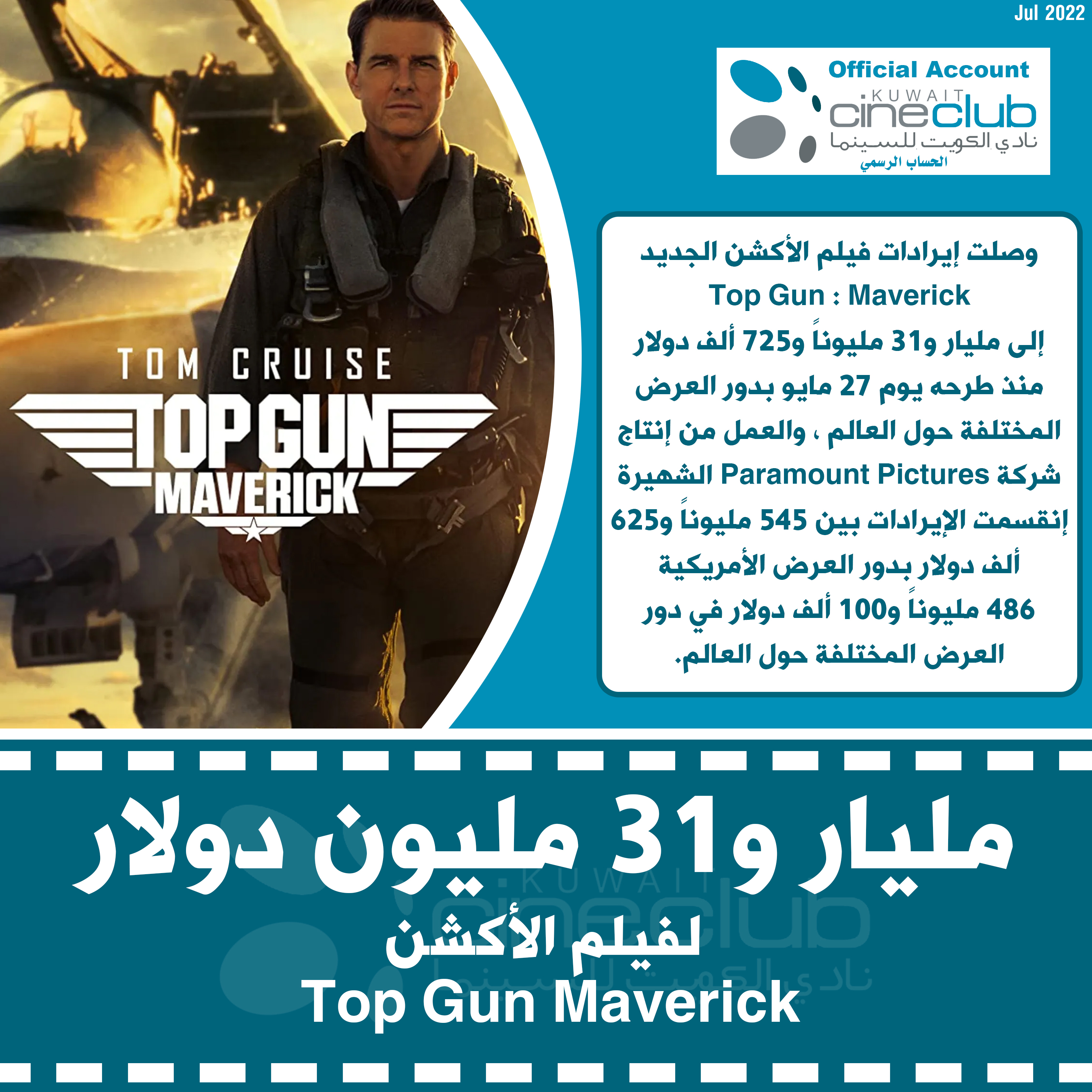 وصلت إيرادات فيلم الأكشن الجديد Top Gun : Maverick إلى مليار و31 مليوناً و725 ألف دولار منذ طرحه يوم 27 مايو بدور العرض المختلفة حول العالم ، والعمل من إنتاج شركة Paramount Pictures الشهيرة إنقسمت الإيرادات بين 545 مليوناً و625 ألف دولار بدور العرض الأمريكية 486 مليوناً و100 ألف دولار في دور العرض المختلفة حول العالم.