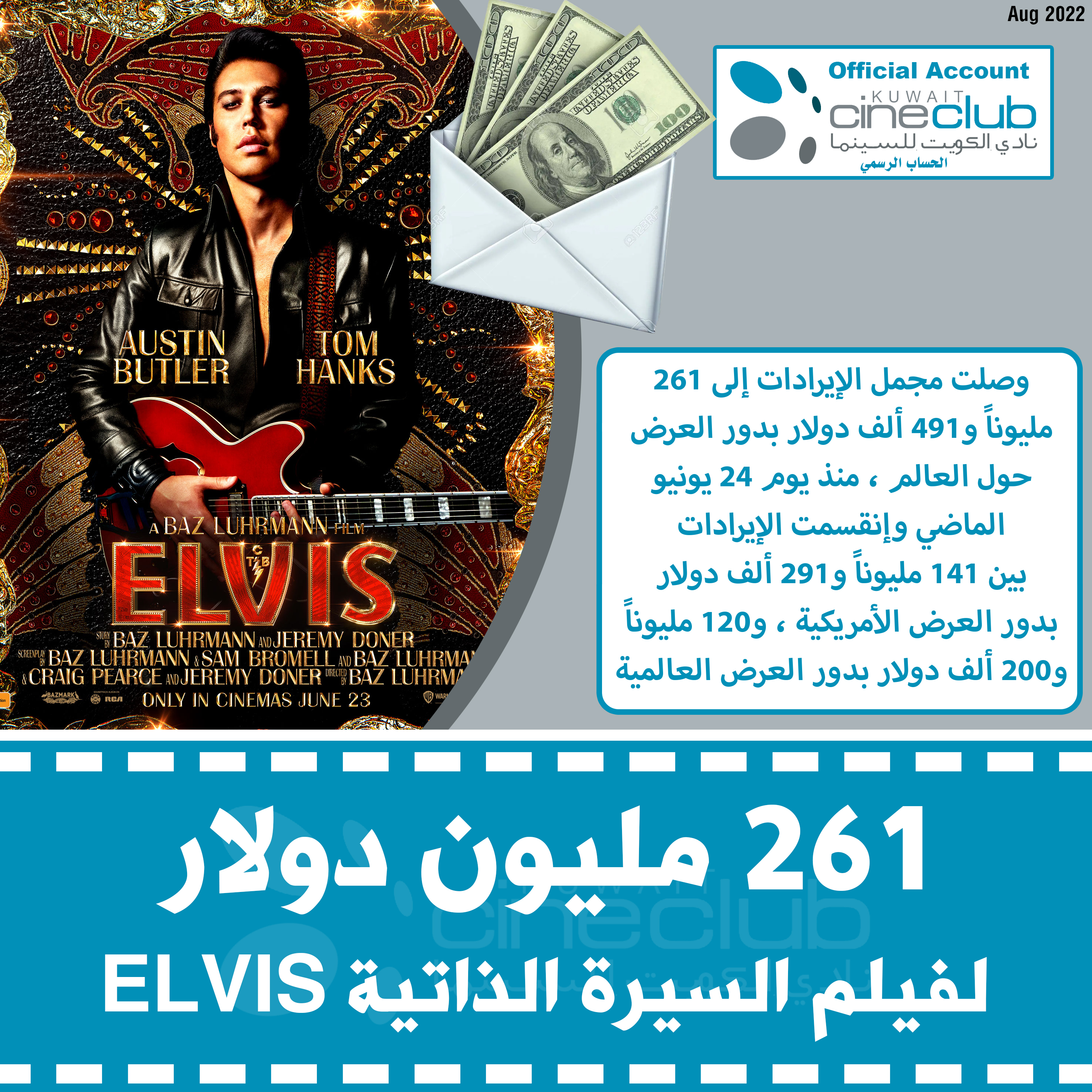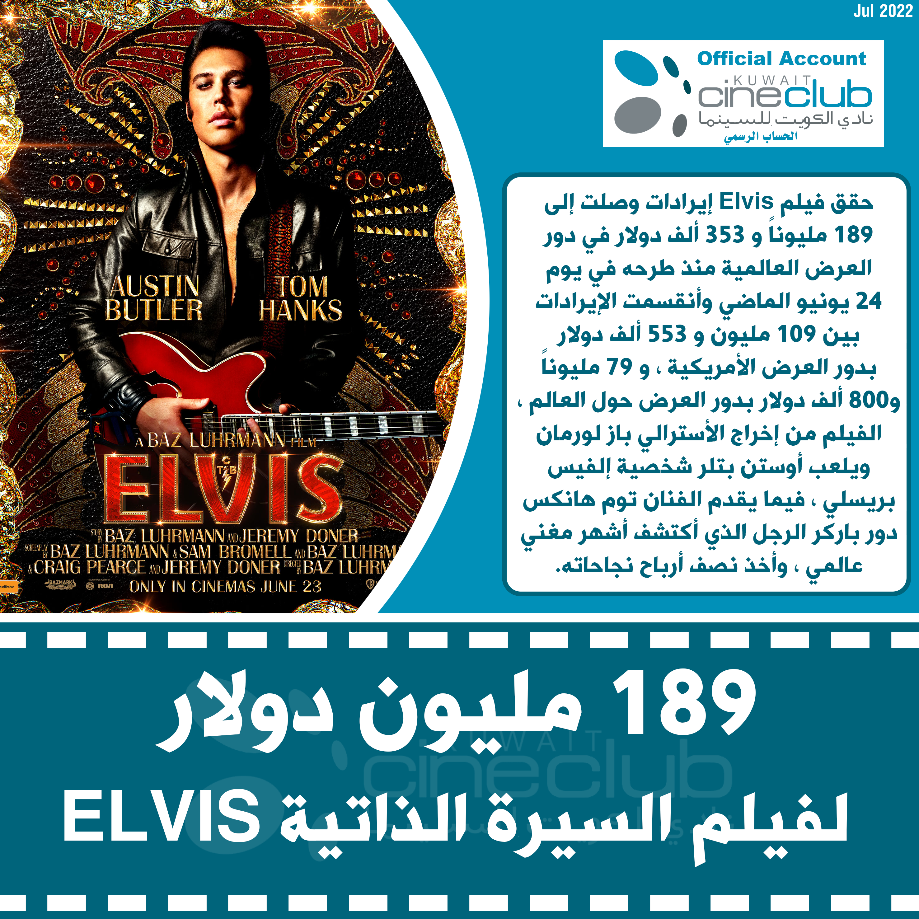 حقق فيلم Elvis إيرادات وصلت إلى 189 مليوناً و 353 ألف دولار في دور العرض العالمية منذ طرحه في يوم 24 يونيو الماضي وأنقسمت الإيرادات بين 109 مليون و 553 ألف دولار بدور العرض الأمريكية ، و 79 مليوناً و800 ألف دولار بدور العرض حول العالم ، الفيلم من إخراج الأسترالي باز لورمان ويلعب أوستن بتلر شخصية إلفيس بريسلي ، فيما يقدم الفنان توم هانكس دور باركر الرجل الذي أكتشف أشهر مغني عالمي ، وأخذ نصف أرباح نجاحاته.
