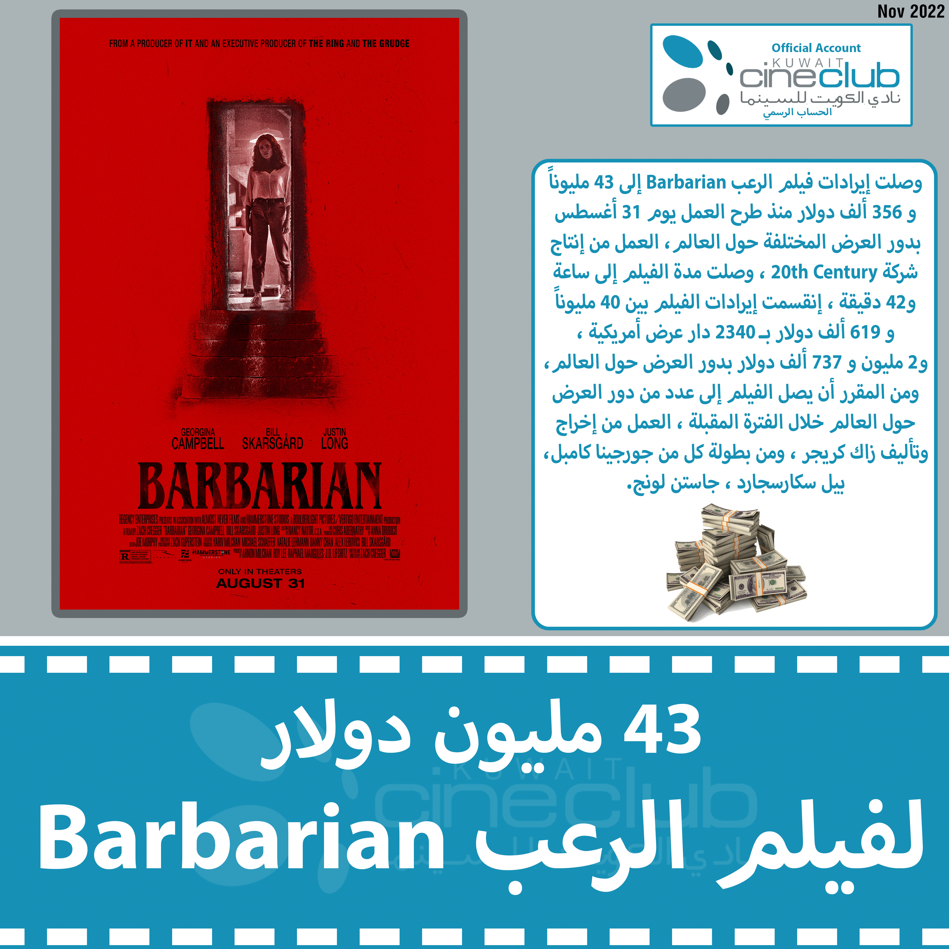 وصلت إيرادات فيلم الرعب Barbarian إلى 43 مليوناً و 356 ألف دولار منذ طرح العمل يوم 31 أغسطس بدور العرض المختلفة حول العالم، العمل من إنتاج شركة 20th Century ، وصلت مدة الفيلم إلى ساعة و42 دقيقة ، إنقسمت إيرادات الفيلم بين 40 مليوناً و 619 ألف دولار بـ 2340 دار عرض أمريكية ، و2 مليون و 737 ألف دولار بدور العرض حول العالم، ومن المقرر أن يصل الفيلم إلى عدد من دور العرض حول العالم خلال الفترة المقبلة ، العمل من إخراج وتأليف زاك كريجر ، ومن بطولة كل من جورجينا كامبل، بيل سكارسجارد ، جاستن لونج.
