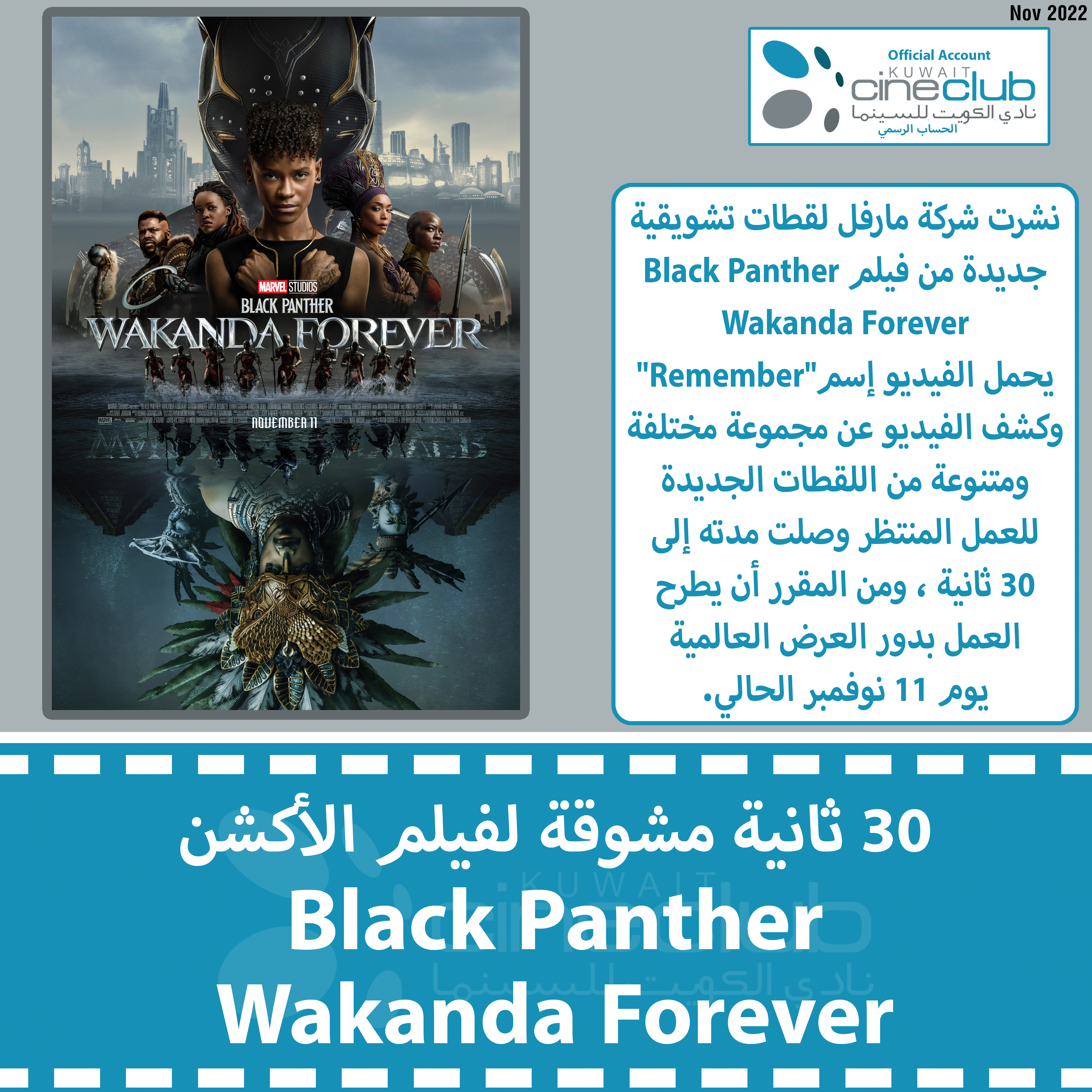 نشرت شركة مارفل لقطات تشويقية جديدة من فيلم Black Panther Wakanda Forever يحمل الفيديو إسم"Remember" وكشف الفيديو عن مجموعة مختلفة ومتنوعة من اللقطات الجديدة للعمل المنتظر وصلت مدته إلى 30 ثانية ، ومن المقرر أن يطرح العمل بدور العرض العالمية يوم 11 نوفمبر الحالي.