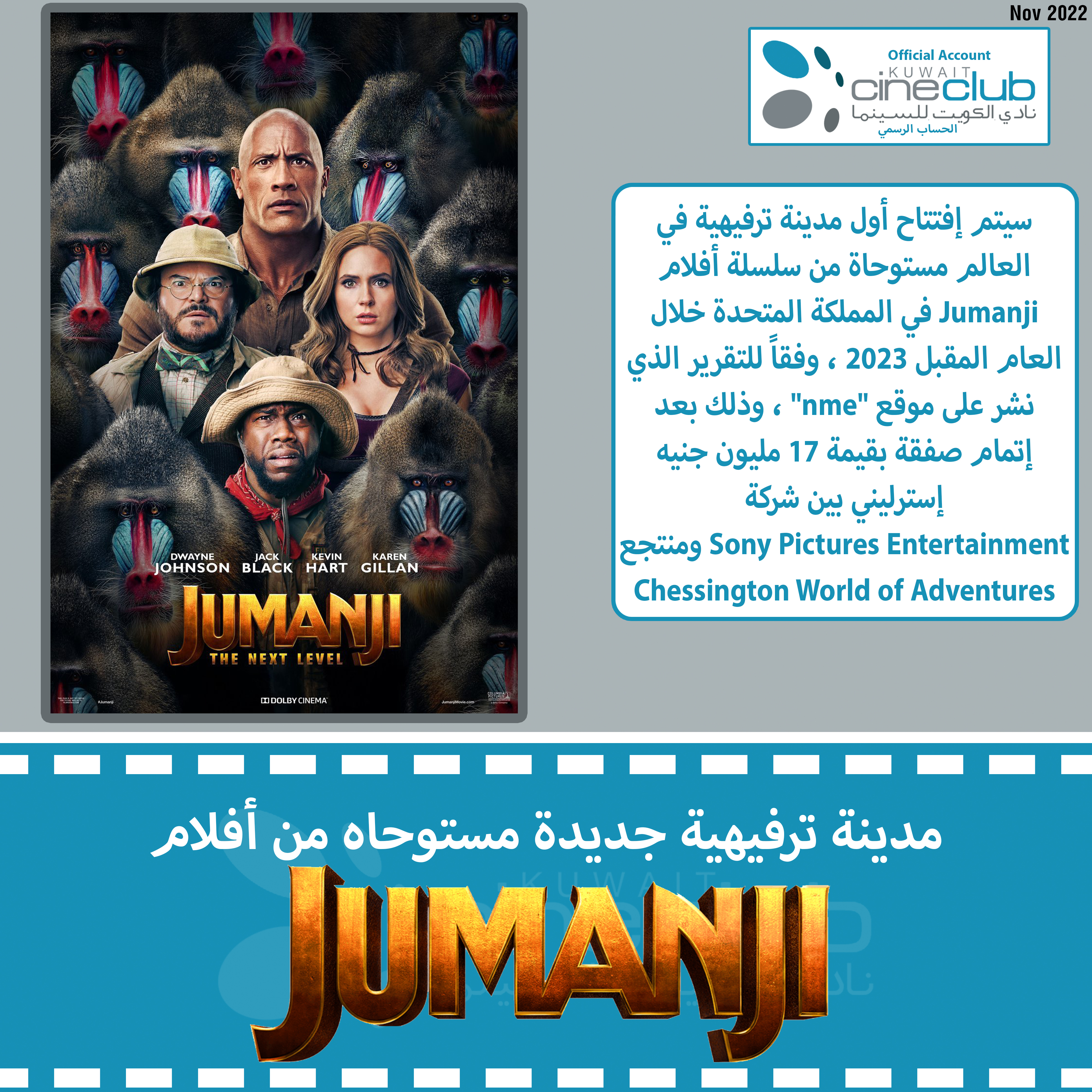 سيتم إفتتاح أول مدينة ترفيهية في العالم مستوحاة من سلسلة أفلام Jumanji في المملكة المتحدة خلال العام المقبل 2023 ، وفقاً للتقرير الذي نشر على موقع "nme" ، وذلك بعد إتمام صفقة بقيمة 17 مليون جنيه إسترليني بين شركة Sony Pictures Entertainment ومنتجع Chessington World of Adventures