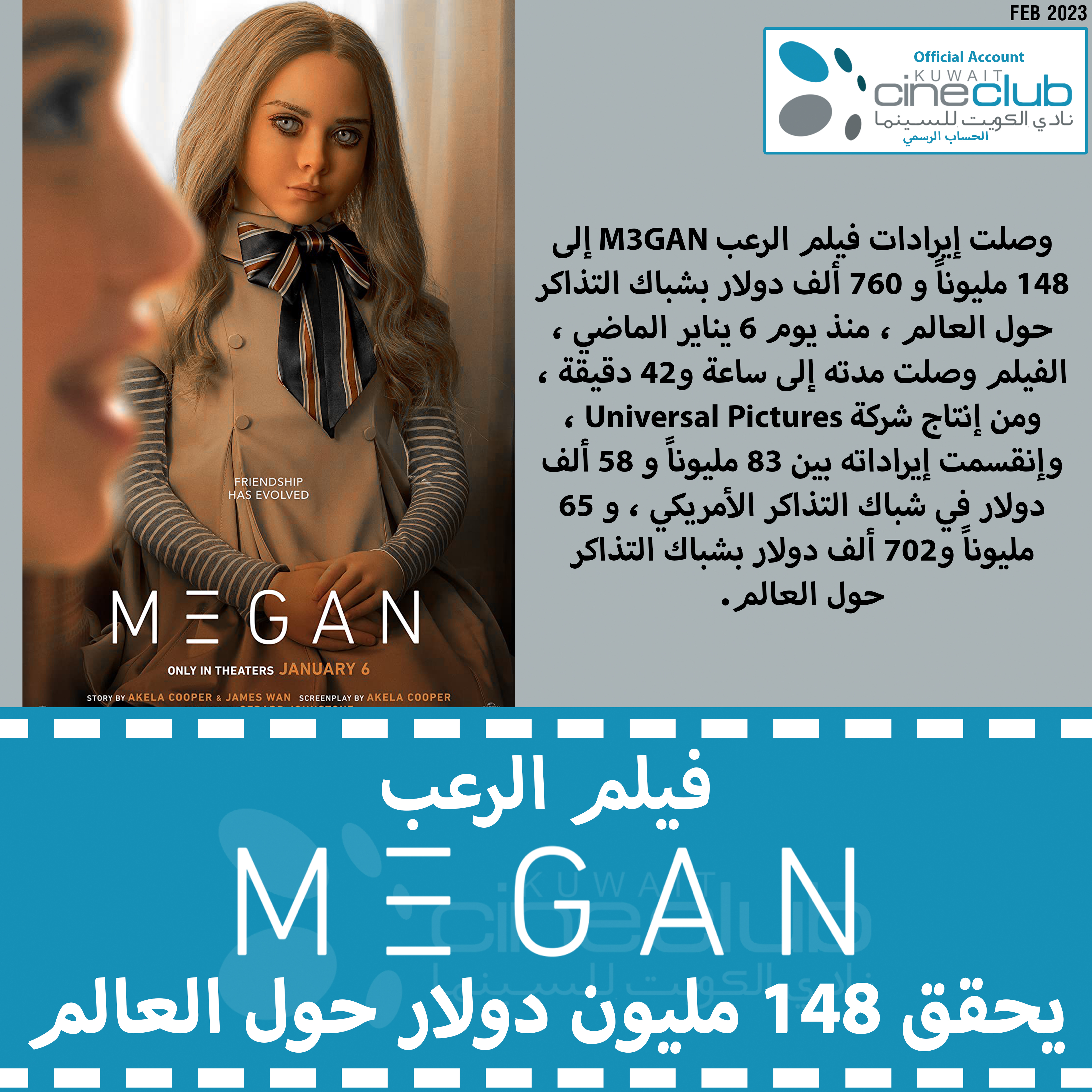 وصلت إيرادات فيلم الرعب M3GAN إلى 148 مليوناً و 760 ألف دولار بشباك التذاكر حول العالم ، منذ يوم 6 يناير الماضي ، الفيلم وصلت مدته إلى ساعة و42 دقيقة ، ومن إنتاج شركة Universal Pictures ، وإنقسمت إيراداته بين 83 مليوناً و 58 ألف دولار في شباك التذاكر الأمريكي ، و 65 مليوناً و702 ألف دولار بشباك التذاكر حول العالم.