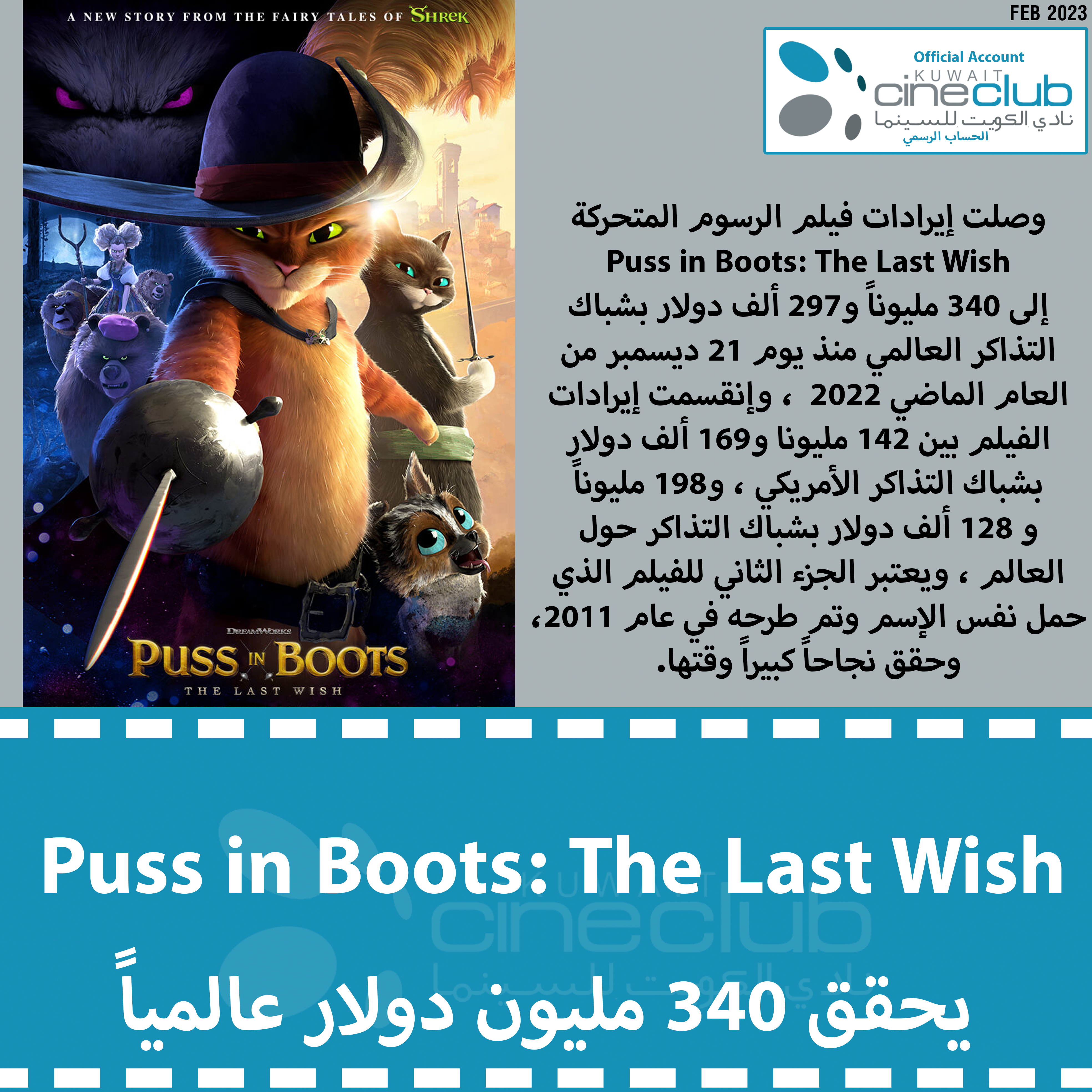 وصلت إيرادات فيلم الرسوم المتحركة Puss in Boots: The Last Wish إلى 340 مليوناً و297 ألف دولار بشباك التذاكر العالمي منذ يوم 21 ديسمبر من العام الماضي 2022 ، وإنقسمت إيرادات الفيلم بين 142 مليونا و169 ألف دولار بشباك التذاكر الأمريكي ، و198 مليوناً و 128 ألف دولار بشباك التذاكر حول العالم ، ويعتبر الجزء الثاني للفيلم الذي حمل نفس الإسم وتم طرحه في عام 2011، وحقق نجاحاً كبيراً وقتها.