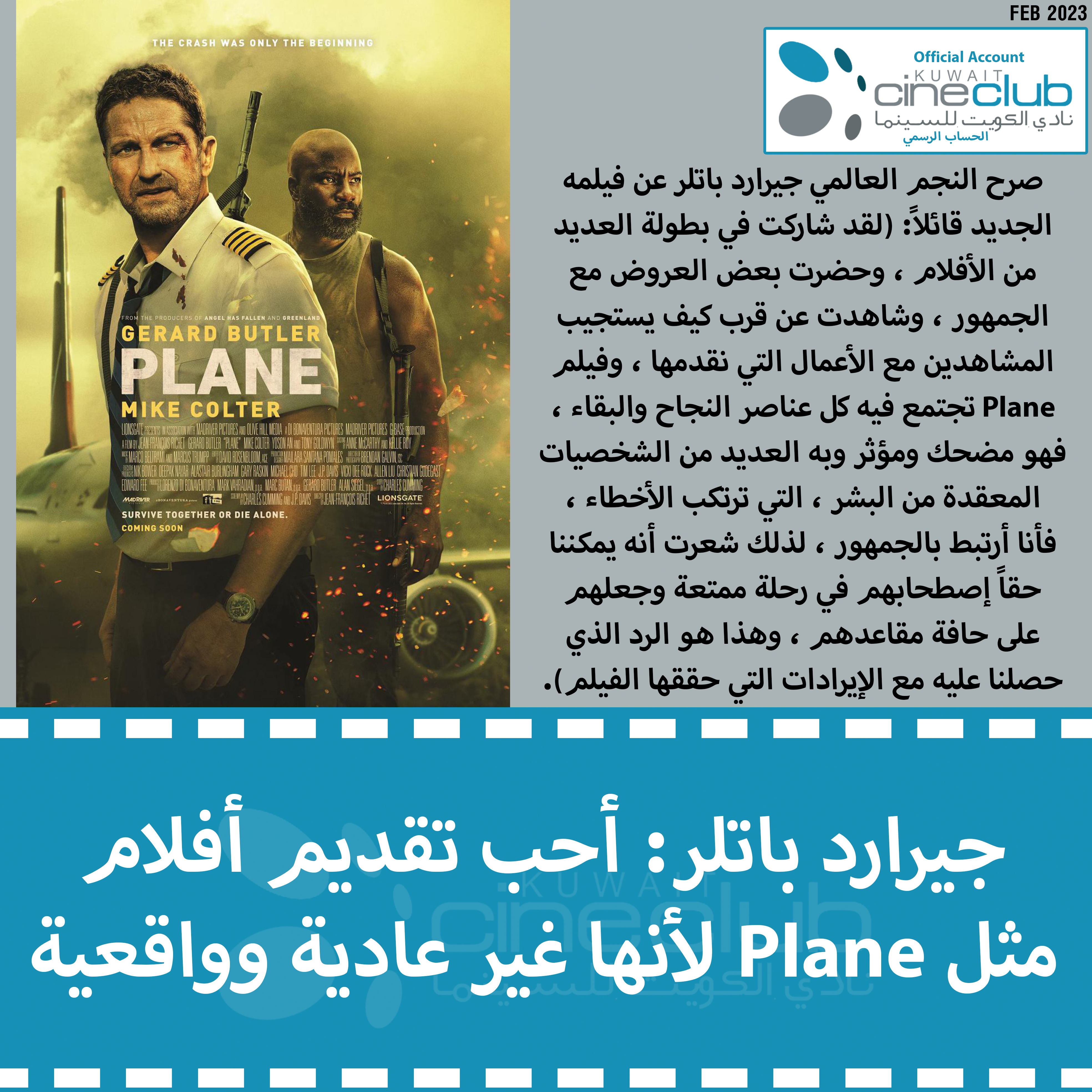 صرح النجم العالمي جيرارد باتلر عن فيلمه الجديد قائلاً: (لقد شاركت في بطولة العديد من الأفلام ، وحضرت بعض العروض مع الجمهور ، وشاهدت عن قرب كيف يستجيب المشاهدين مع الأعمال التي نقدمها ، وفيلم Plane تجتمع فيه كل عناصر النجاح والبقاء ، فهو مضحك ومؤثر وبه العديد من الشخصيات المعقدة من البشر ، التي ترتكب الأخطاء ، فأنا أرتبط بالجمهور ، لذلك شعرت أنه يمكننا حقاً إصطحابهم في رحلة ممتعة وجعلهم على حافة مقاعدهم ، وهذا هو الرد الذي حصلنا عليه مع الإيرادات التي حققها الفيلم).
