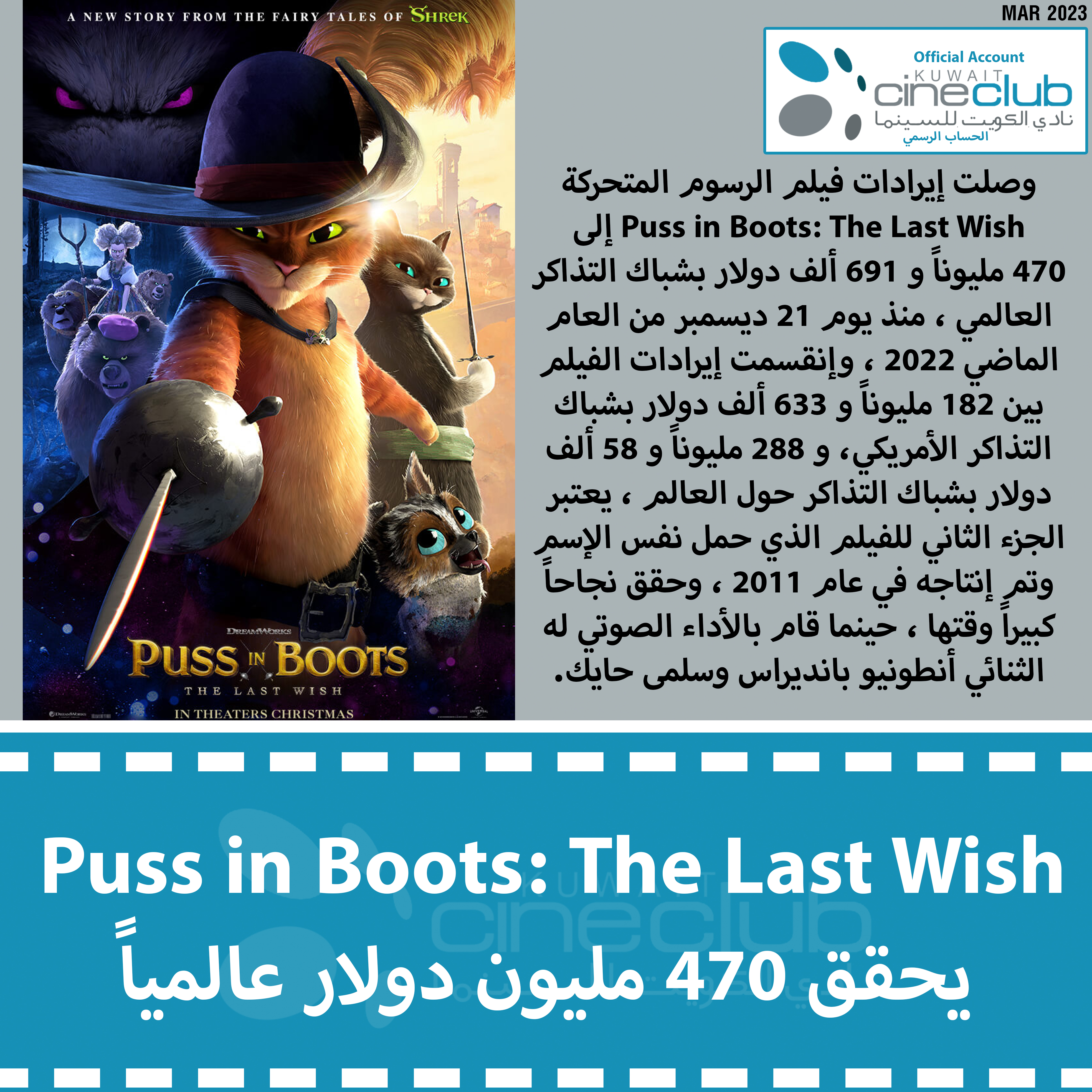 وصلت إيرادات فيلم الرسوم المتحركة Puss in Boots: The Last Wish إلى 470 مليوناً و 691 ألف دولار بشباك التذاكر العالمي ، منذ يوم 21 ديسمبر من العام الماضي 2022 ، وإنقسمت إيرادات الفيلم بين 182 مليوناً و 633 ألف دولار بشباك التذاكر الأمريكي، و 288 مليوناً و 58 ألف دولار بشباك التذاكر حول العالم ، يعتبر الجزء الثاني للفيلم الذي حمل نفس الإسم وتم إنتاجه في عام 2011 ، وحقق نجاحاً كبيراً وقتها ، حينما قام بالأداء الصوتي له الثنائي أنطونيو بانديراس وسلمى حايك.