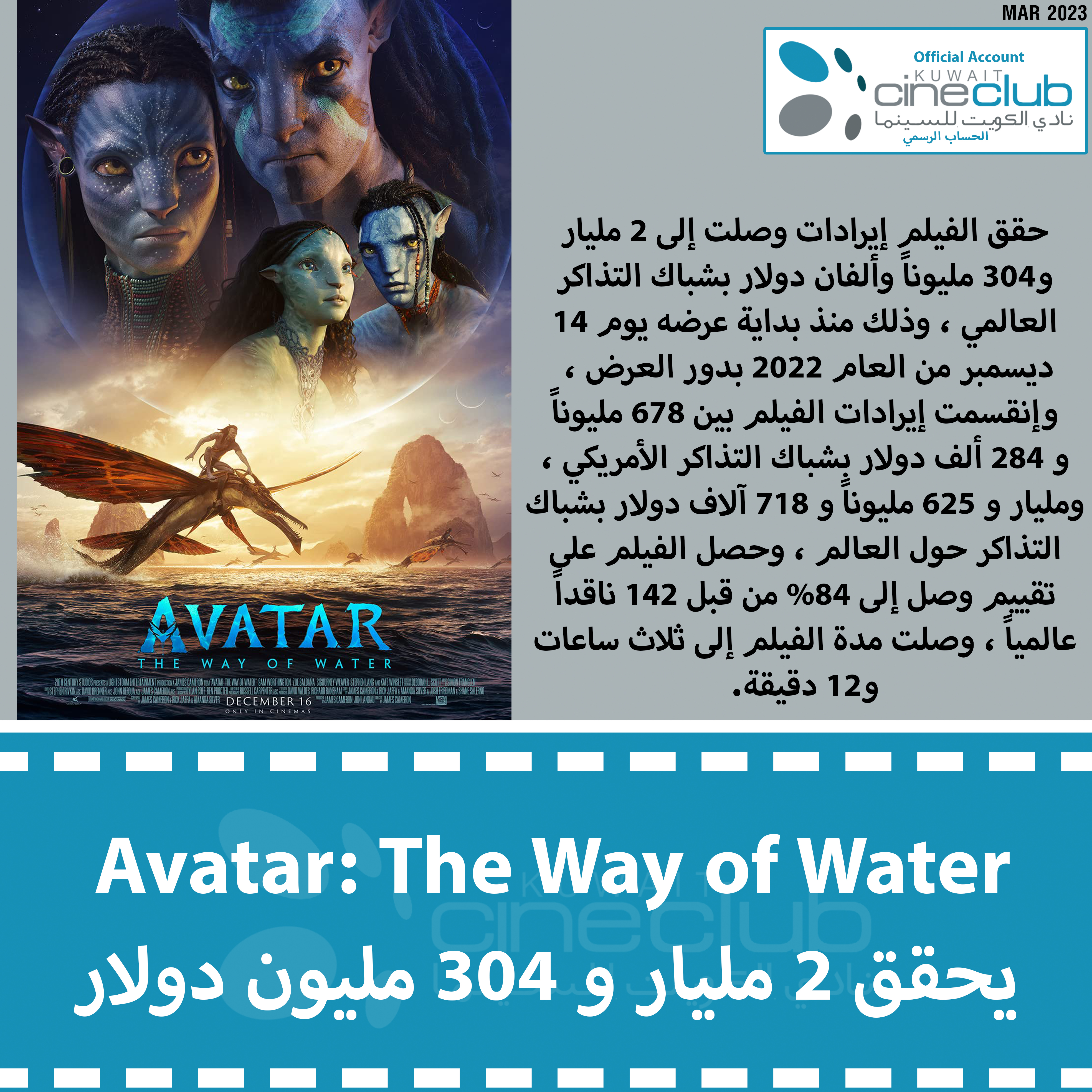 حقق الفيلم إيرادات وصلت إلى 2 مليار و304 مليوناً وألفان دولار بشباك التذاكر العالمي ، وذلك منذ بداية عرضه يوم 14 ديسمبر من العام 2022 بدور العرض ، وإنقسمت إيرادات الفيلم بين 678 مليوناً و 284 ألف دولار بشباك التذاكر الأمريكي ، ومليار و 625 مليوناً و 718 آلاف دولار بشباك التذاكر حول العالم ، وحصل الفيلم على تقييم وصل إلى 84% من قبل 142 ناقداً عالمياً ، وصلت مدة الفيلم إلى ثلاث ساعات و12 دقيقة.