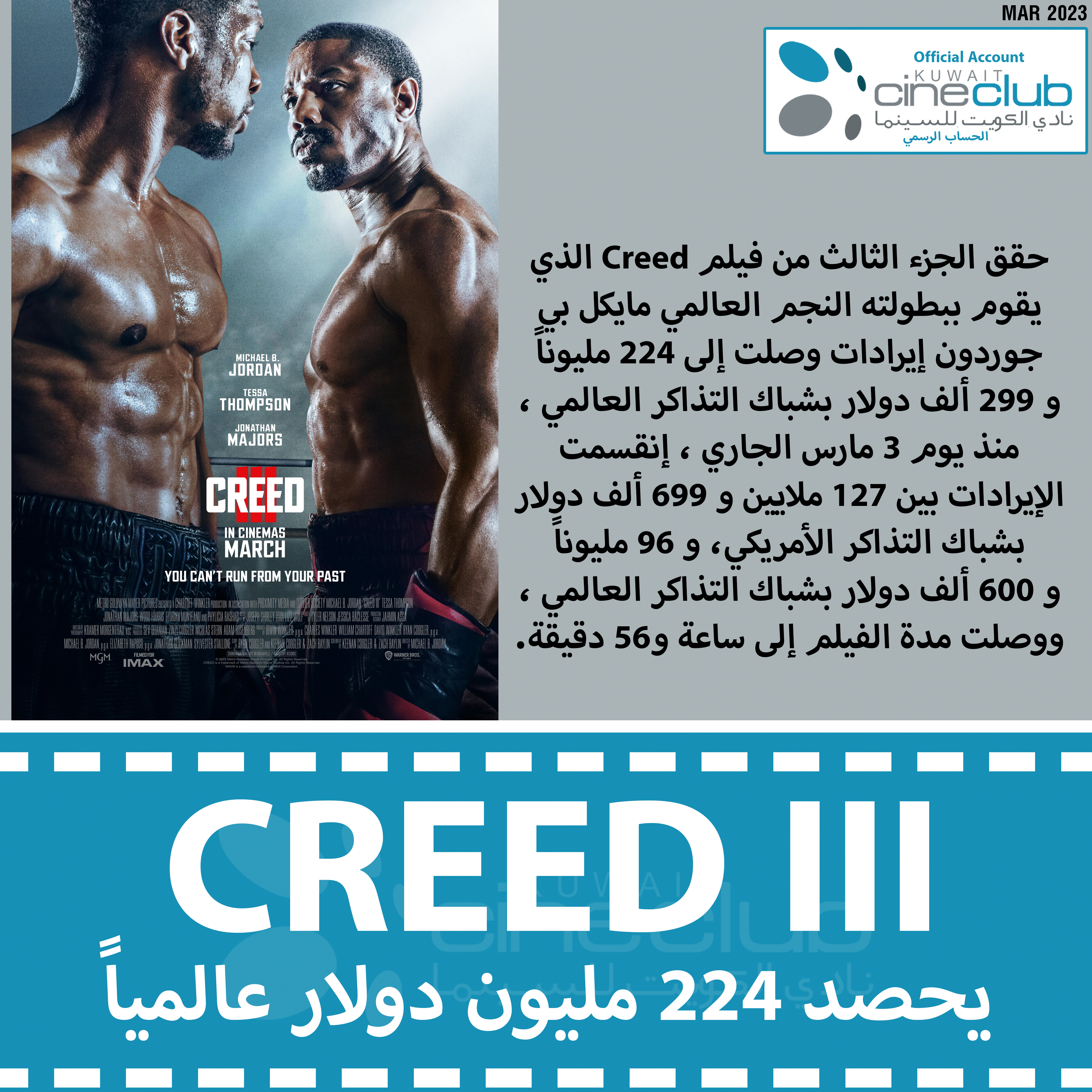 حقق الجزء الثالث من فيلم Creed الذي يقوم ببطولته النجم العالمي مايكل بي جوردون إيرادات وصلت إلى 224 مليوناً و 299 ألف دولار بشباك التذاكر العالمي ، منذ يوم 3 مارس الجاري ، إنقسمت الإيرادات بين 127 ملايين و 699 ألف دولار بشباك التذاكر الأمريكي، و 96 مليوناً و 600 ألف دولار بشباك التذاكر العالمي ، ووصلت مدة الفيلم إلى ساعة و56 دقيقة.