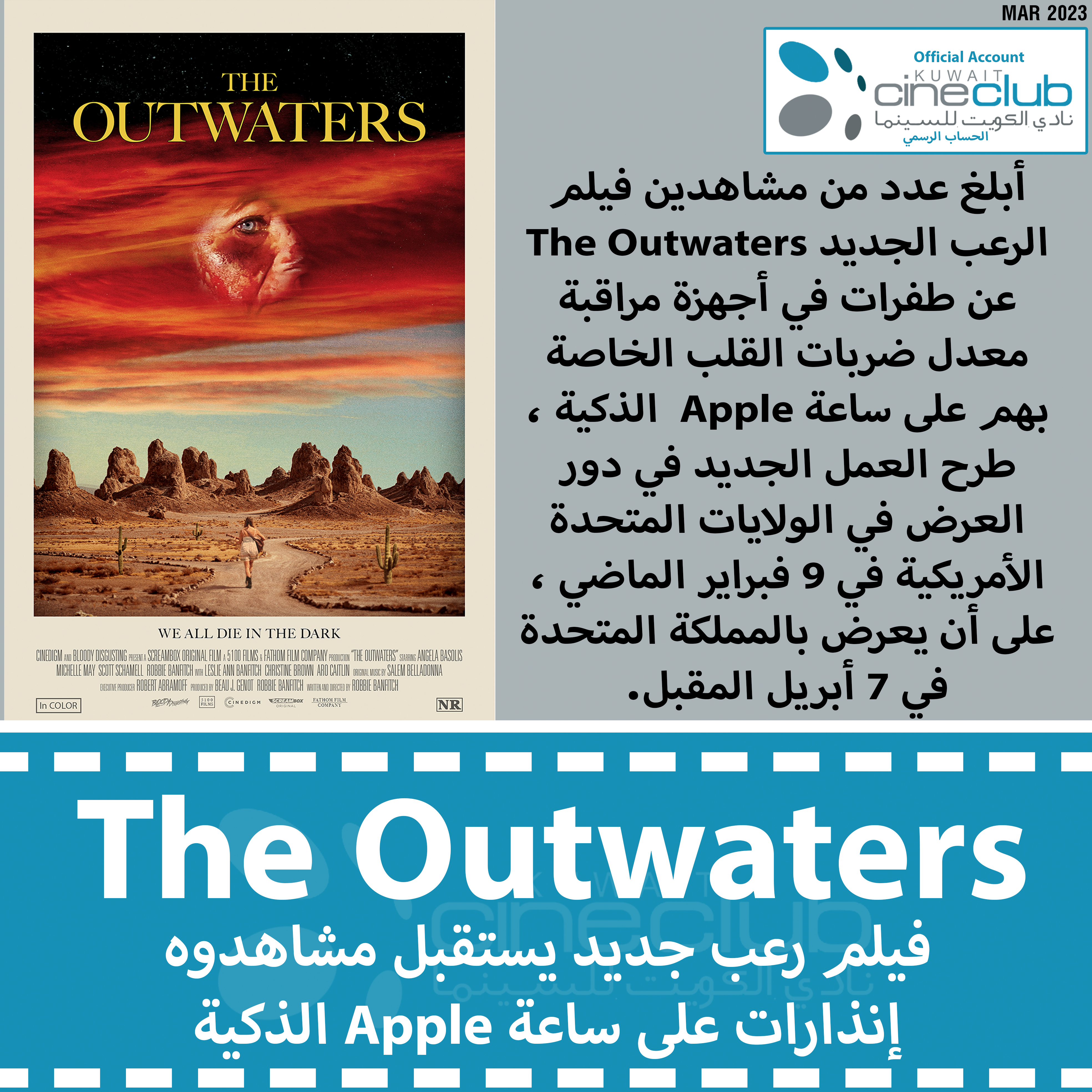 أبلغ عدد من مشاهدين فيلم الرعب الجديد The Outwaters عن طفرات في أجهزة مراقبة معدل ضربات القلب الخاصة بهم على ساعة Apple الذكية ، طرح العمل الجديد في دور العرض في الولايات المتحدة الأمريكية في 9 فبراير الماضي ، على أن يعرض بالمملكة المتحدة في 7 أبريل المقبل.