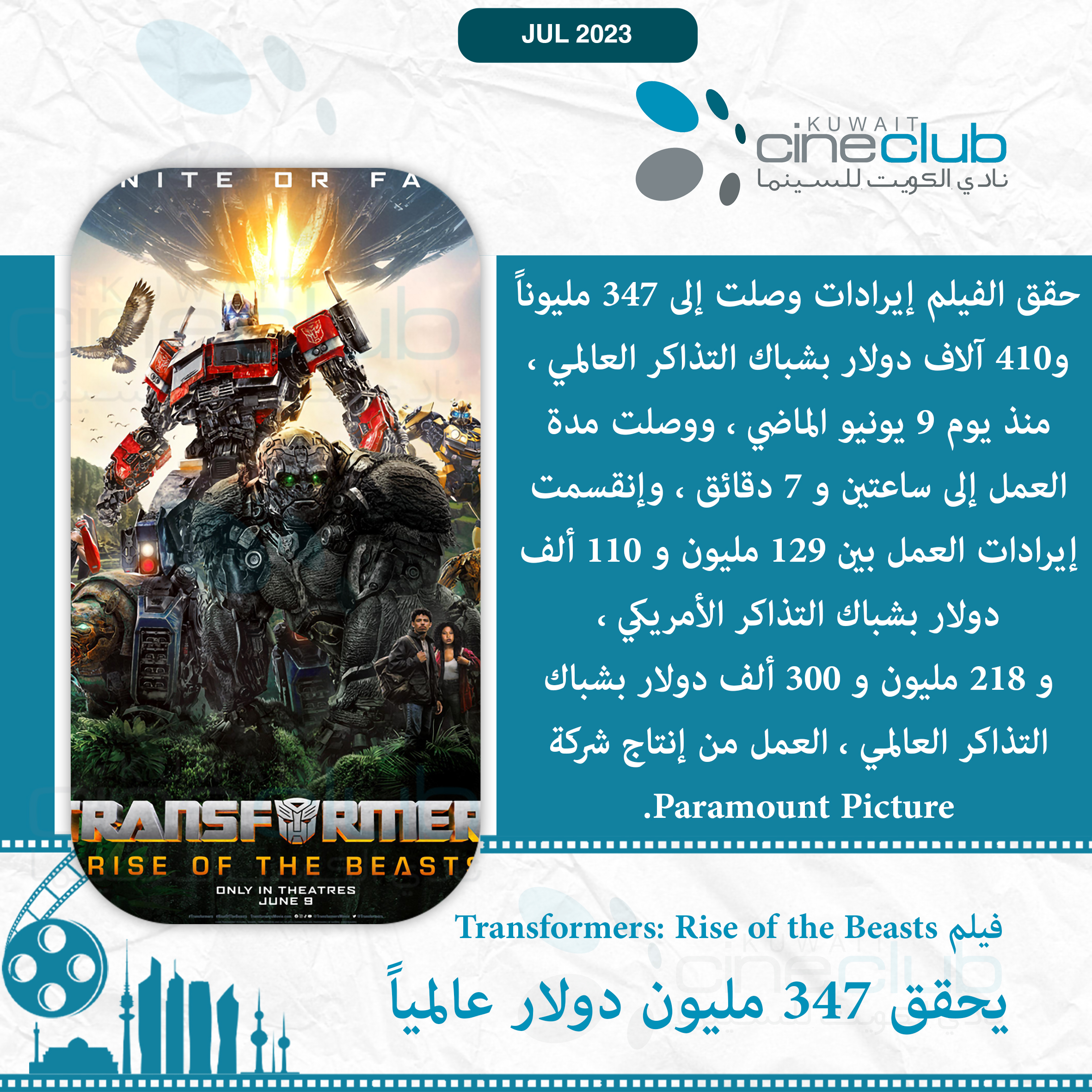 فيلم Transformers: Rise of the Beasts يحقق 347 مليون دولار عالمياً