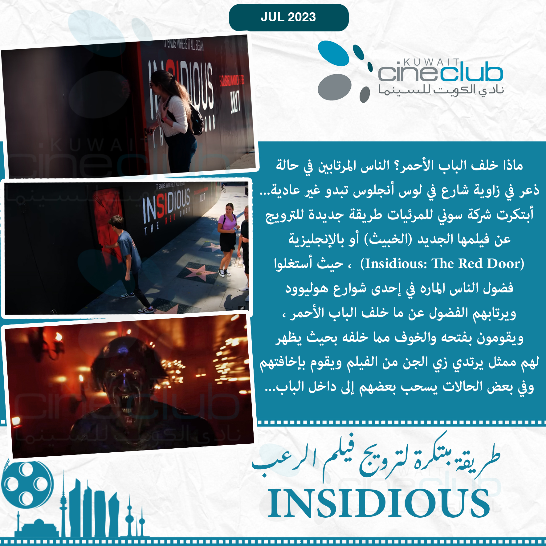 ماذا خلف الباب الأحمر؟ الناس المرتابين في حالة ذعر في زاوية شارع في لوس أنجلوس تبدو غير عادية... أبتكرت شركة سوني للمرئيات طريقة جديدة للترويج عن فيلمها الجديد (الخبيث) أو بالإنجليزية (Insidious: The Red Door) ، حيث أستغلوا فضول الناس الماره في إحدى شوارع هوليوود ويرتابهم الفضول عن ما خلف الباب الأحمر ، ويقومون بفتحه والخوف مما خلفه بحيث يظهر لهم ممثل يرتدي زي الجن من الفيلم ويقوم بإخافتهم وفي بعض الحالات يسحب بعضهم إلى داخل الباب...