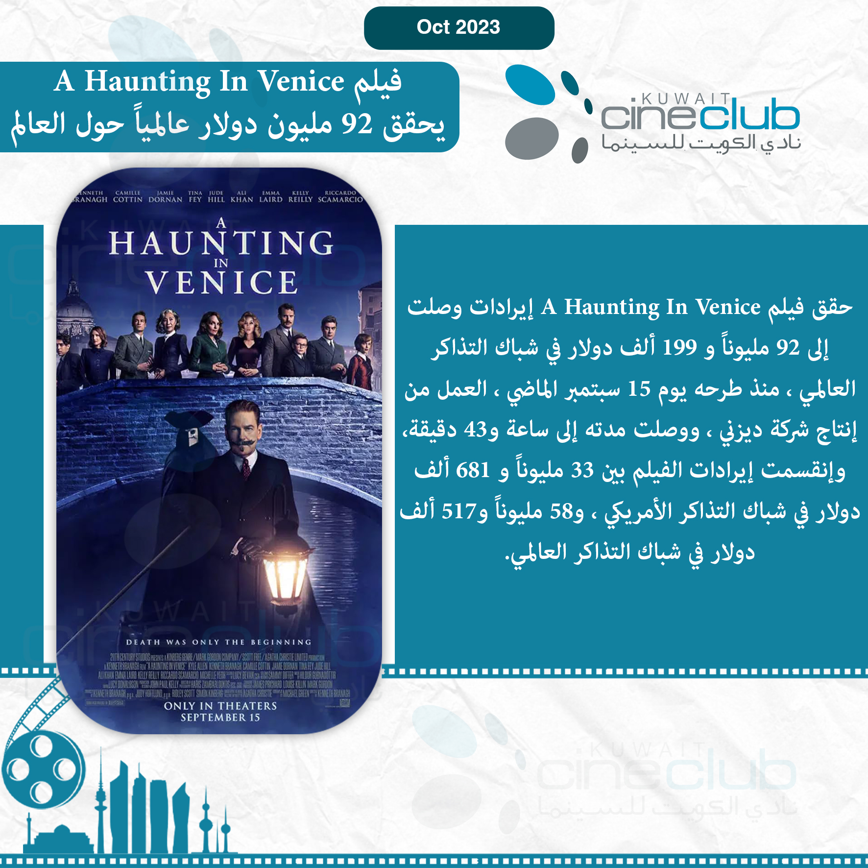 فيلم A Haunting In Venice يحقق 92 مليون دولار عالمياً حول العالم