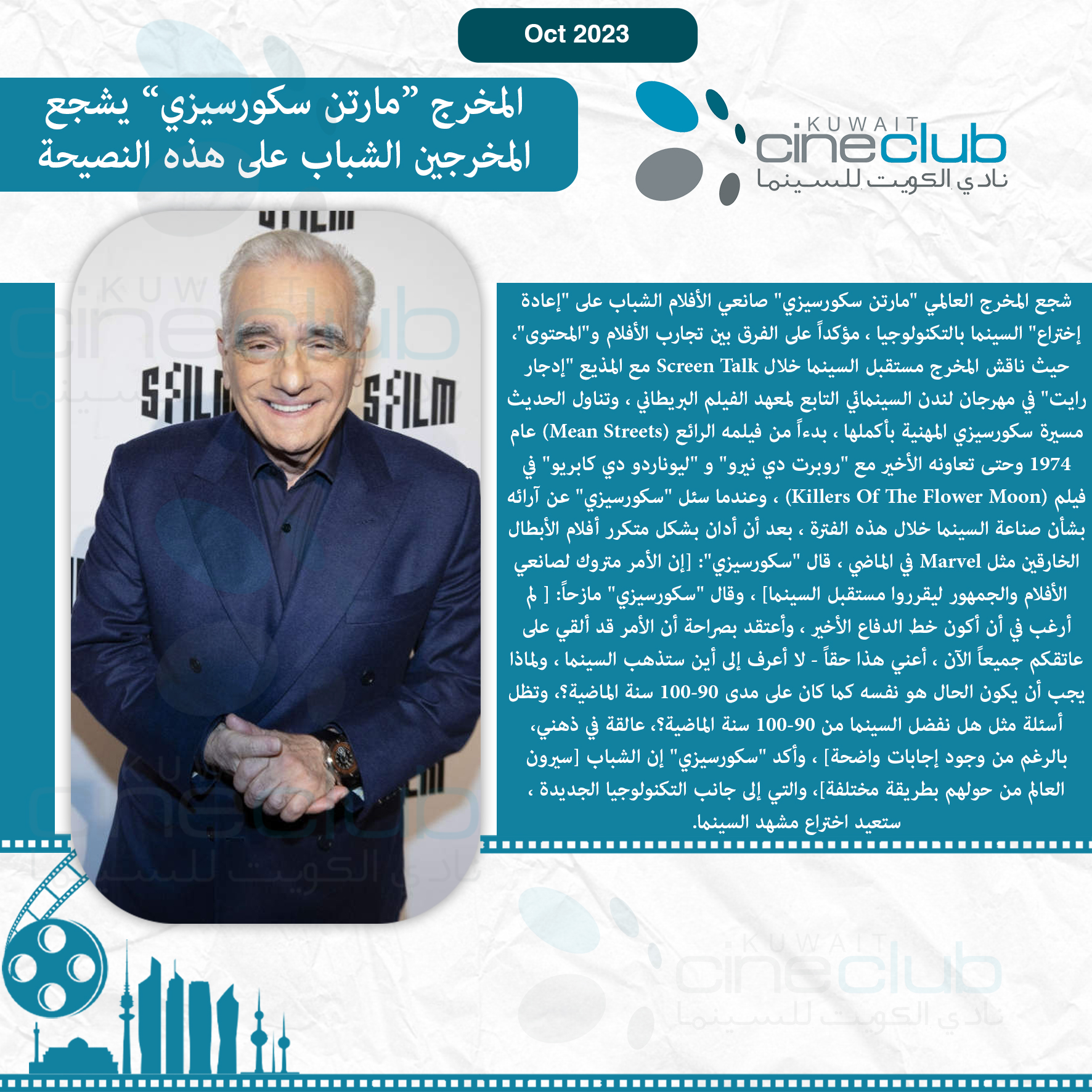 شجع المخرج العالمي "مارتن سكورسيزي" صانعي الأفلام الشباب على "إعادة إختراع" السينما بالتكنولوجيا ، مؤكداً على الفرق بين تجارب الأفلام و"المحتوى"، حيث ناقش المخرج مستقبل السينما خلال Screen Talk مع المذيع "إدجار رايت" في مهرجان لندن السينمائي التابع لمعهد الفيلم البريطاني ، وتناول الحديث مسيرة سكورسيزي المهنية بأكملها ، بدءاً من فيلمه الرائع (Mean Streets) عام 1974 وحتى تعاونه الأخير مع "روبرت دي نيرو" و "ليوناردو دي كابريو" في فيلم (Killers Of The Flower Moon) ، وعندما سئل "سكورسيزي" عن آرائه بشأن صناعة السينما خلال هذه الفترة ، بعد أن أدان بشكل متكرر أفلام الأبطال الخارقين مثل Marvel في الماضي ، قال "سكورسيزي": [إن الأمر متروك لصانعي الأفلام والجمهور ليقرروا مستقبل السينما] ، وقال "سكورسيزي" مازحاً: [ لم أرغب في أن أكون خط الدفاع الأخير ، وأعتقد بصراحة أن الأمر قد ألقي على عاتقكم جميعاً الآن ، أعني هذا حقاً - لا أعرف إلى أين ستذهب السينما ، ولماذا يجب أن يكون الحال هو نفسه كما كان على مدى 90-100 سنة الماضية؟، وتظل أسئلة مثل هل نفضل السينما من 90-100 سنة الماضية؟، عالقة في ذهني، بالرغم من وجود إجابات واضحة] ، وأكد "سكورسيزي" إن الشباب [سيرون العالم من حولهم بطريقة مختلفة]، والتي إلى جانب التكنولوجيا الجديدة ، ستعيد اختراع مشهد السينما.