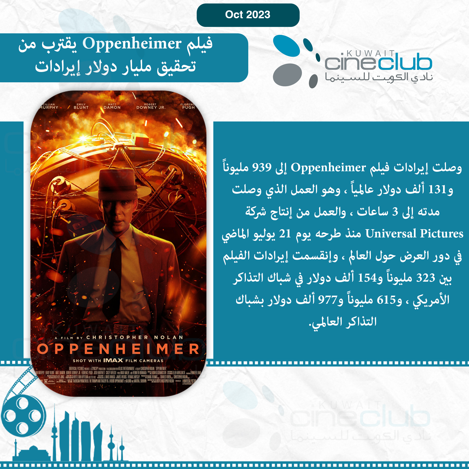 وصلت إيرادات فيلم Oppenheimer إلى 939 مليوناً و131 ألف دولار عالمياً ، وهو العمل الذي وصلت مدته إلى 3 ساعات ، والعمل من إنتاج شركة Universal Pictures منذ طرحه يوم 21 يوليو الماضي في دور العرض حول العالم ، وإنقسمت إيرادات الفيلم بين 323 مليوناً و154 ألف دولار في شباك التذاكر الأمريكي ، و615 مليوناً و977 ألف دولار بشباك التذاكر العالمي.