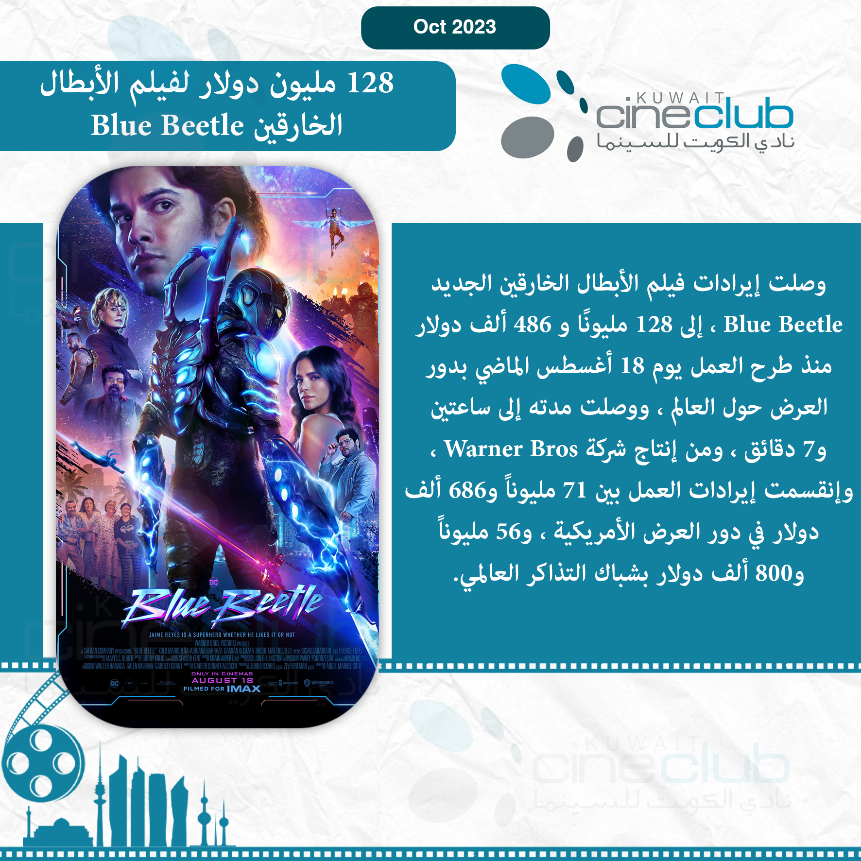 وصلت إيرادات فيلم الأبطال الخارقين الجديد Blue Beetle ، إلى 128 مليونًا و 486 ألف دولار منذ طرح العمل يوم 18 أغسطس الماضي بدور العرض حول العالم ، ووصلت مدته إلى ساعتين و7 دقائق ، ومن إنتاج شركة Warner Bros ، وإنقسمت إيرادات العمل بين 71 مليوناً و686 ألف دولار في دور العرض الأمريكية ، و56 مليوناً و800 ألف دولار بشباك التذاكر العالمي.