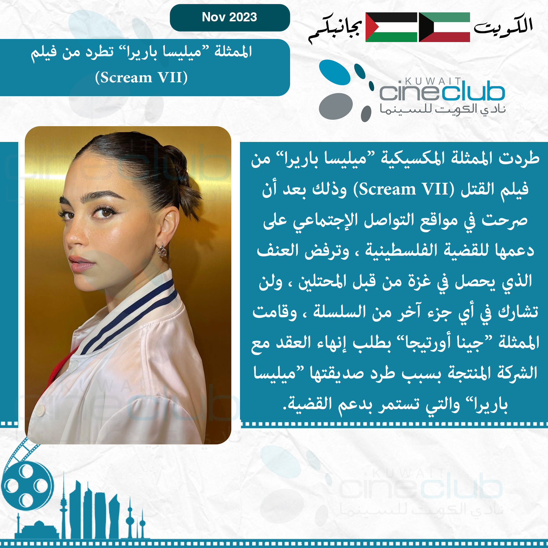 طردت الممثلة المكسيكية ”ميليسا باريرا“ من فيلم القتل (Scream VII) وذلك بعد أن صرحت في مواقع التواصل الإجتماعي على دعمها للقضية الفلسطينية ، وترفض العنف الذي يحصل في غزة من قبل المحتلين ، ولن تشارك في أي جزء آخر من السلسلة ، وقامت الممثلة ”جينا أورتيجا“ بطلب إنهاء العقد مع الشركة المنتجة بسبب طرد صديقتها ”ميليسا باريرا“ والتي تستمر بدعم القضية.