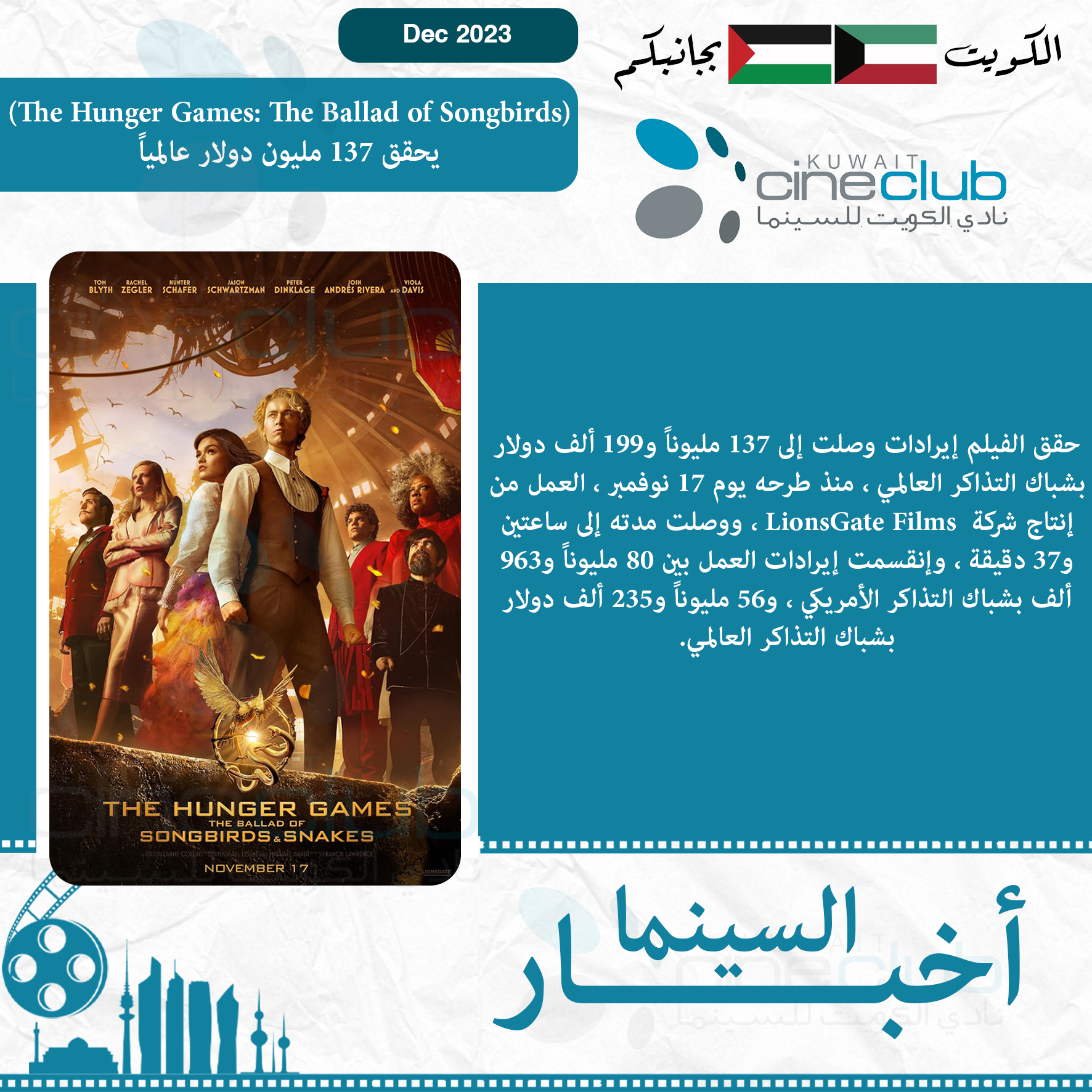 (The Hunger Games: The Ballad of Songbirds) يحقق 137 مليون دولار عالمياً