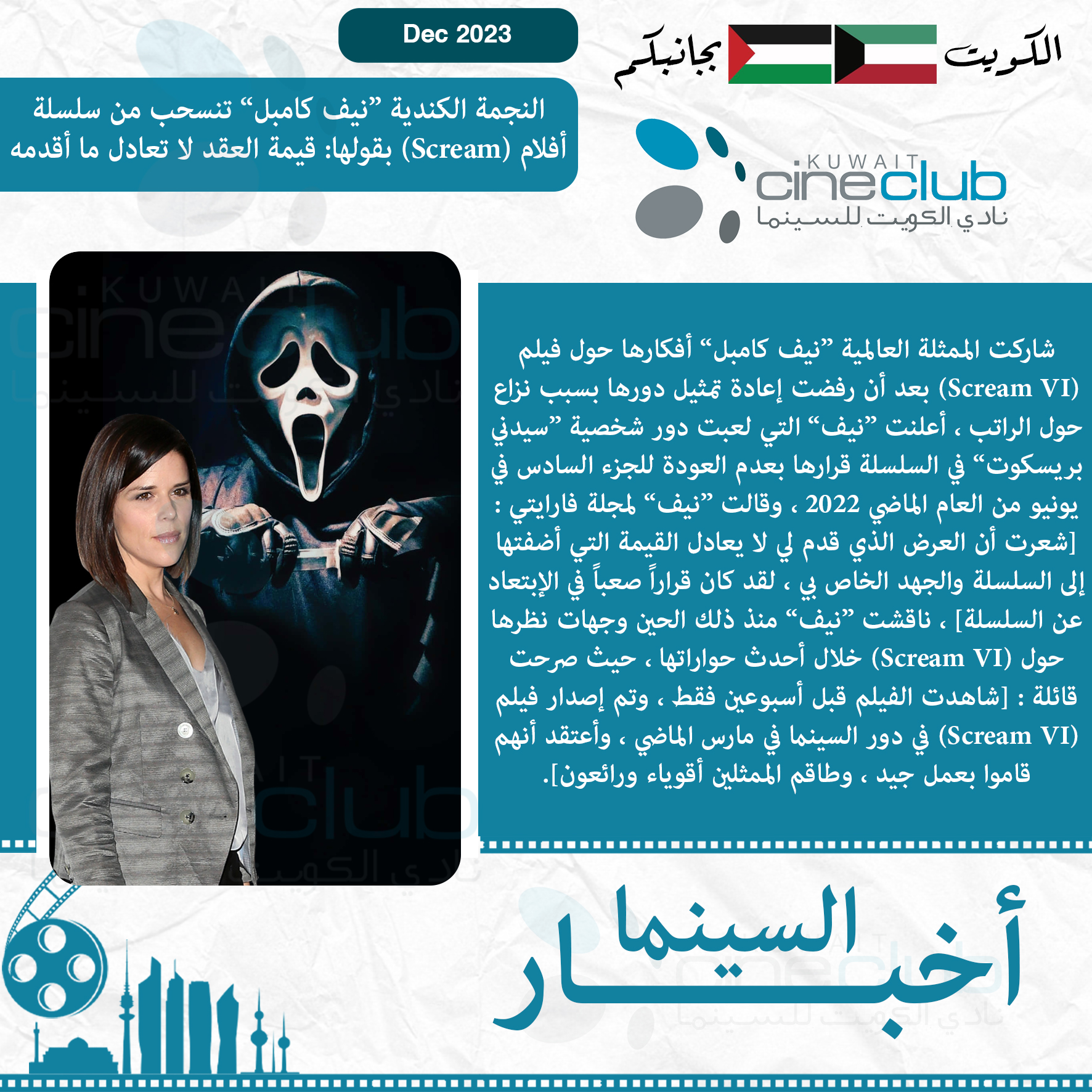 شاركت الممثلة العالمية ”نيف كامبل“ أفكارها حول فيلم (Scream VI) بعد أن رفضت إعادة تمثيل دورها بسبب نزاع حول الراتب ، أعلنت ”نيف“ التي لعبت دور شخصية ”سيدني بريسكوت“ في السلسلة قرارها بعدم العودة للجزء السادس في يونيو من العام الماضي 2022 ، وقالت ”نيف“ لمجلة فارايتي : [شعرت أن العرض الذي قدم لي لا يعادل القيمة التي أضفتها إلى السلسلة والجهد الخاص بي ، لقد كان قراراً صعباً في الإبتعاد عن السلسلة] ، ناقشت ”نيف“ منذ ذلك الحين وجهات نظرها حول (Scream VI) خلال أحدث حواراتها ، حيث صرحت قائلة : [شاهدت الفيلم قبل أسبوعين فقط ، وتم إصدار فيلم (Scream VI) في دور السينما في مارس الماضي ، وأعتقد أنهم قاموا بعمل جيد ، وطاقم الممثلين أقوياء ورائعون].