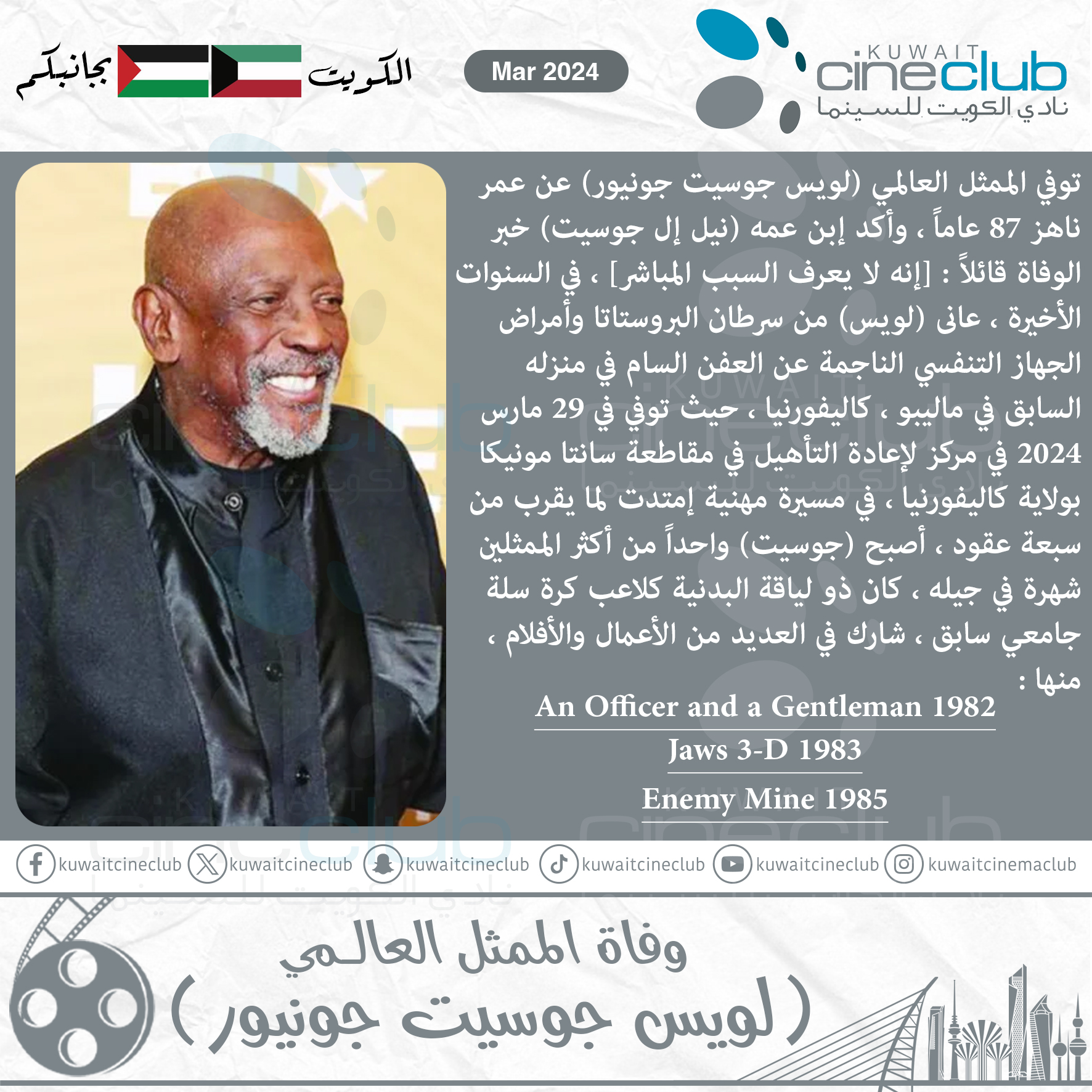 توفي الممثل العالمي (لويس جوسيت جونيور) عن عمر ناهز 87 عاماً ، وأكد إبن عمه (نيل إل جوسيت) خبر الوفاة قائلاً : [إنه لا يعرف السبب المباشر] ، في السنوات الأخيرة ، عانى (لويس) من سرطان البروستاتا وأمراض الجهاز التنفسي الناجمة عن العفن السام في منزله السابق في ماليبو ، كاليفورنيا ، حيث توفي في 29 مارس 2024 في مركز لإعادة التأهيل في مقاطعة سانتا مونيكا بولاية كاليفورنيا ، في مسيرة مهنية إمتدت لما يقرب من سبعة عقود ، أصبح (جوسيت) واحداً من أكثر الممثلين شهرة في جيله ، كان ذو لياقة البدنية كلاعب كرة سلة جامعي سابق ، شارك في العديد من الأعمال والأفلام ، منها : (An Officer and a Gentleman 1982) و (Jaws 3-D 1983) و (Enemy Mine 1985).