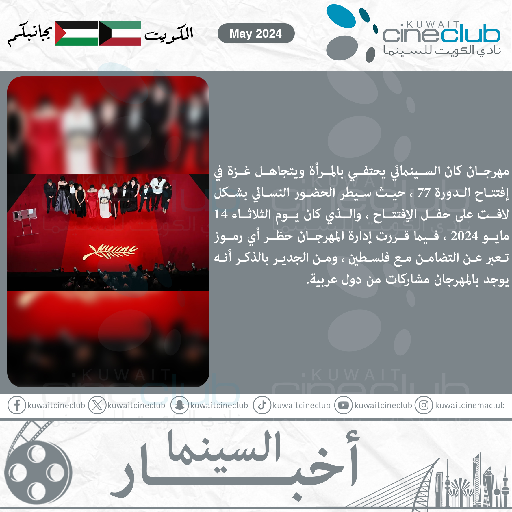 مهرجان كان السينمائي يحتفي بالمرأة ويتجاهل غزة في إفتتاح الدورة 77 ، حيث سيطر الحضور النسائي بشكل لافت على حفل الإفتتاح ، والذي كان يوم الثلاثاء 14 مايو 2024 ، فيما قررت إدارة المهرجان حظر أي رموز تعبر عن التضامن مع فلسطين ، ومن الجدير بالذكر أنه يوجد بالمهرجان مشاركات من دول عربية.