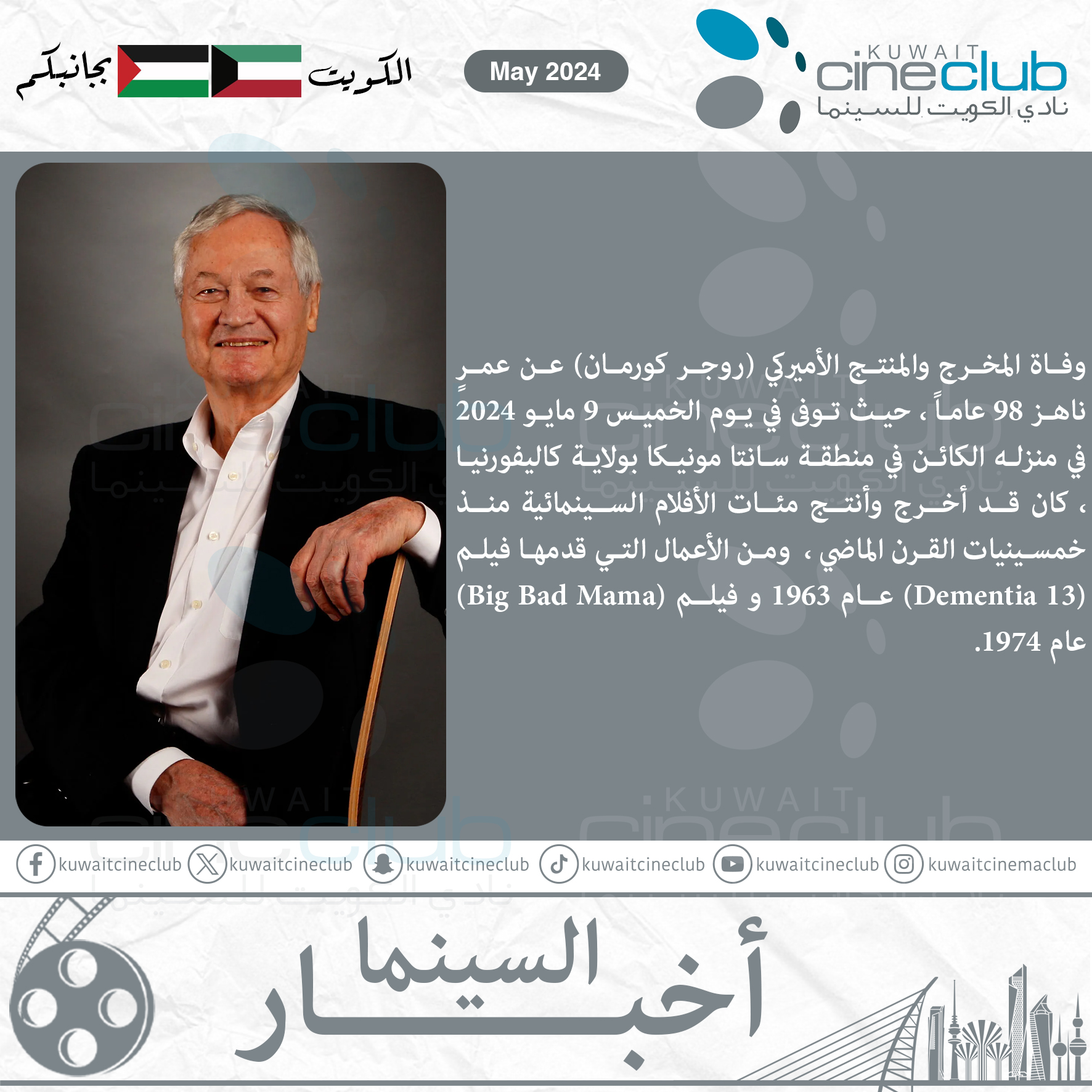 وفاة المخرج والمنتج الأميركي (روجر كورمان) عن عمرٍ ناهز 98 عاماً ، حيث توفى في يوم الخميس 9 مايو 2024 في منزله الكائن في منطقة سانتا مونيكا بولاية كاليفورنيا ، كان قد أخرج وأنتج مئات الأفلام السينمائية منذ خمسينيات القرن الماضي ، ومن الأعمال التي قدمها فيلم (Dementia 13) عام 1963 و فيلم (Big Bad Mama) عام 1974.