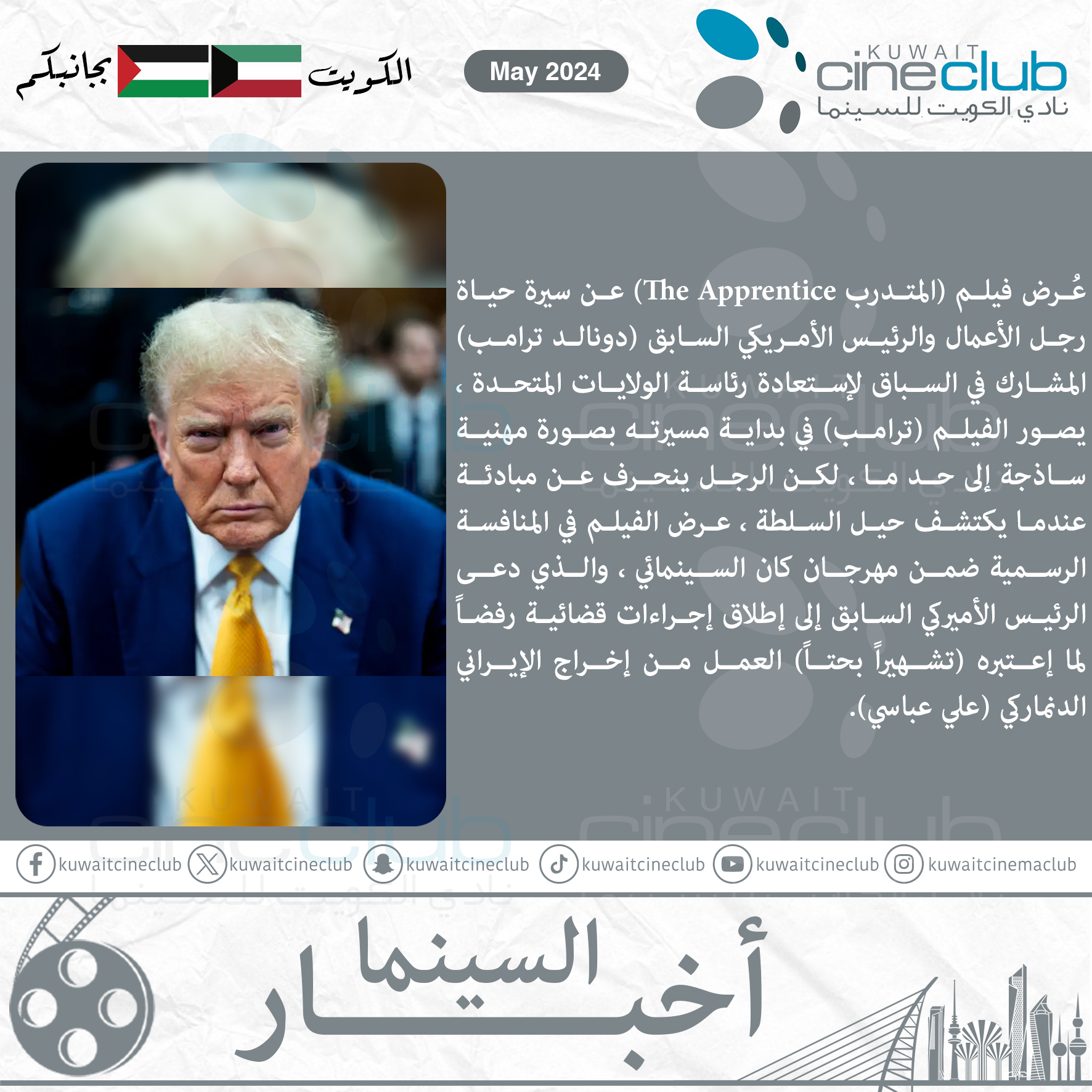 عُرض فيلم (المتدرب The Apprentice) عن سيرة حياة رجل الأعمال والرئيس الأمريكي السابق (دونالد ترامب) المشارك في السباق لإستعادة رئاسة الولايات المتحدة ، يصور الفيلم (ترامب) في بداية مسيرته بصورة مهنية ساذجة إلى حد ما ، لكن الرجل ينحرف عن مبادئة عندما يكتشف حيل السلطة ، عرض الفيلم في المنافسة الرسمية ضمن مهرجان كان السينمائي ، والذي دعى الرئيس الأميركي السابق إلى إطلاق إجراءات قضائية رفضاً لما إعتبره (تشهيراً بحتاً) العمل من إخراج الإيراني الدنماركي (علي عباسي).