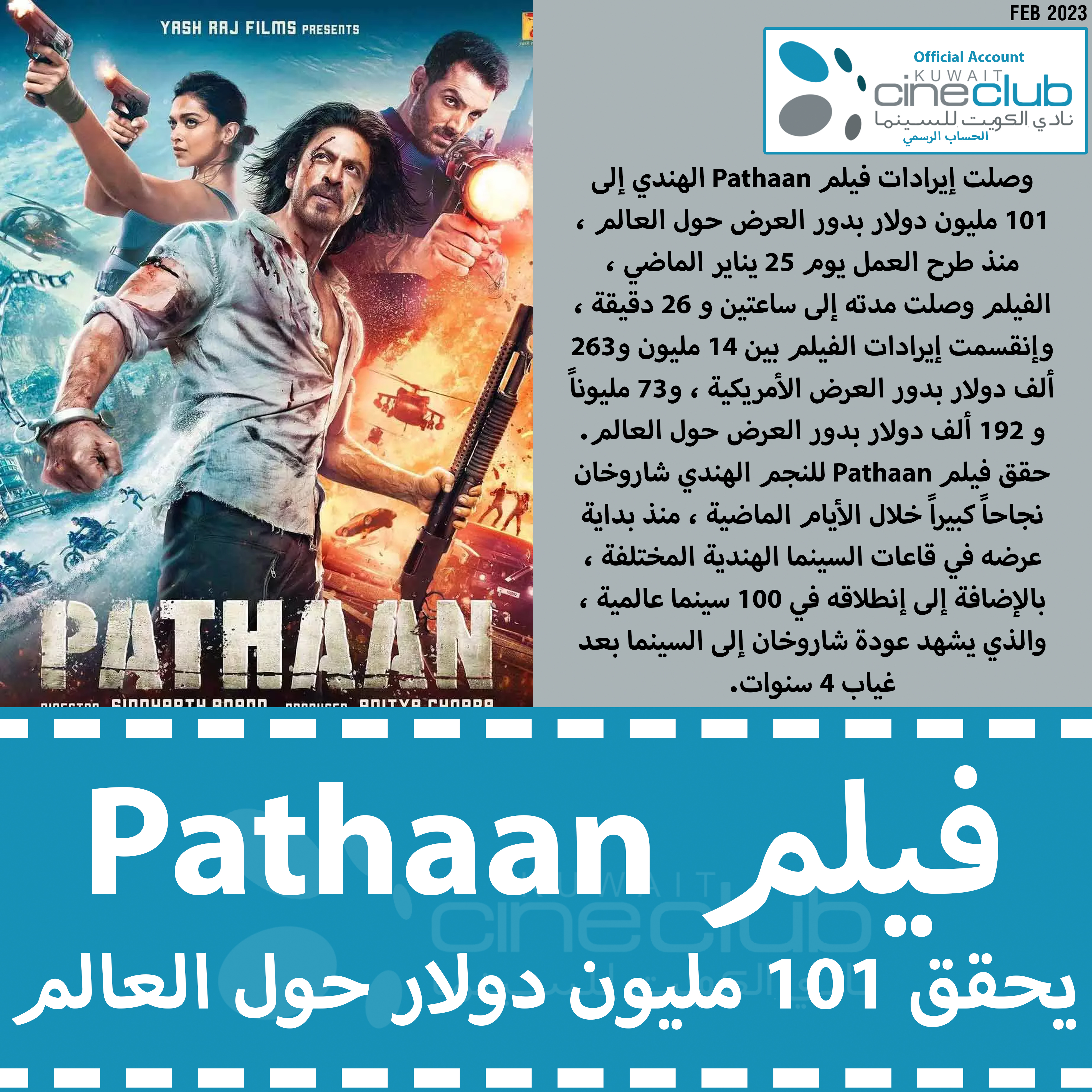 وصلت إيرادات فيلم Pathaan الهندي إلى 101 مليون دولار بدور العرض حول العالم ، منذ طرح العمل يوم 25 يناير الماضي ، الفيلم وصلت مدته إلى ساعتين و 26 دقيقة ، وإنقسمت إيرادات الفيلم بين 14 مليون و263 ألف دولار بدور العرض الأمريكية ، و73 مليوناً و 192 ألف دولار بدور العرض حول العالم. حقق فيلم Pathaan للنجم الهندي شاروخان نجاحاً كبيراً خلال الأيام الماضية ، منذ بداية عرضه في قاعات السينما الهندية المختلفة ، بالإضافة إلى إنطلاقه في 100 سينما عالمية ، والذي يشهد عودة شاروخان إلى السينما بعد غياب 4 سنوات.